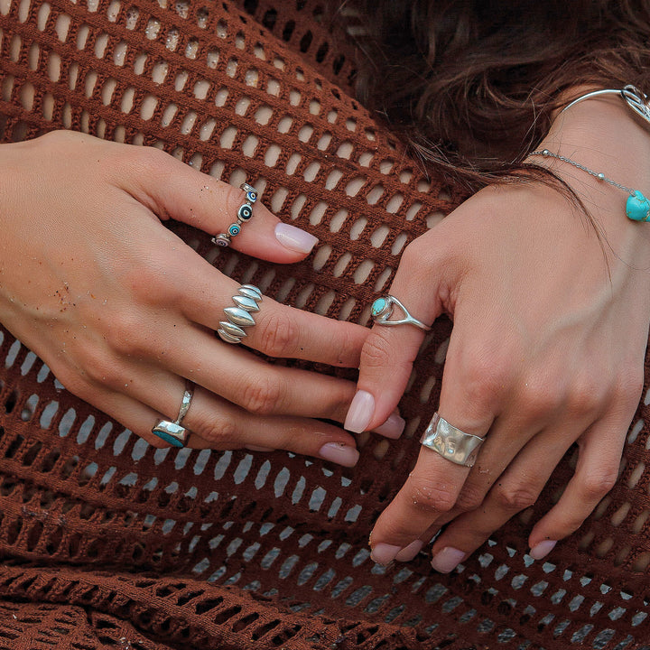 This Aqua Swirl Elegance Turquoise Silver Wave Ring by Mejoma is a stunning statement piece. The adjustable ring features unique turquoise gemstone shapes, ranging from 7mm to 12mm, with beautiful swirls of turquoise and gold. It's a true work of art that adds a touch of elegance and sophistication to any outfit. The natural irregularities of each gemstone are to be celebrated.