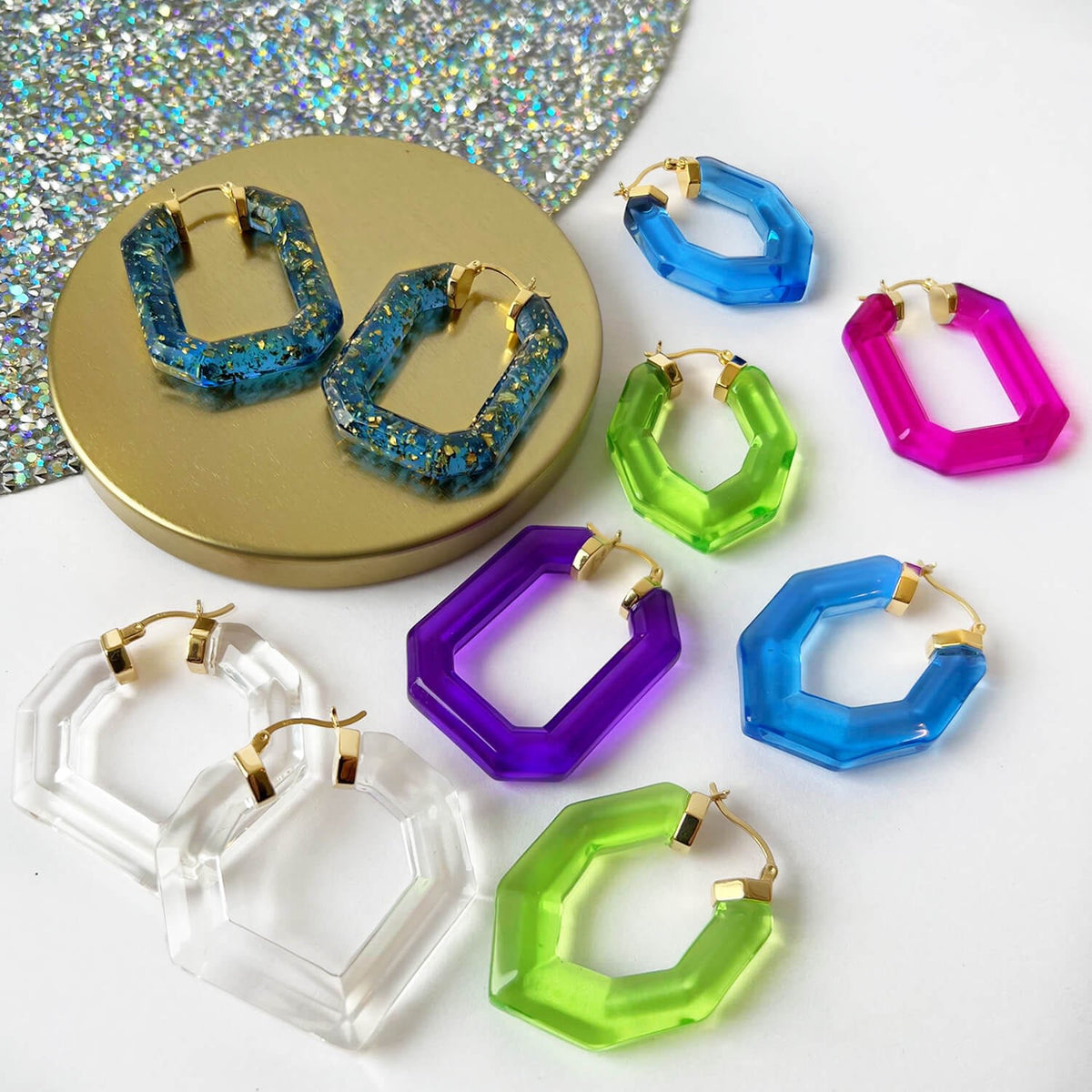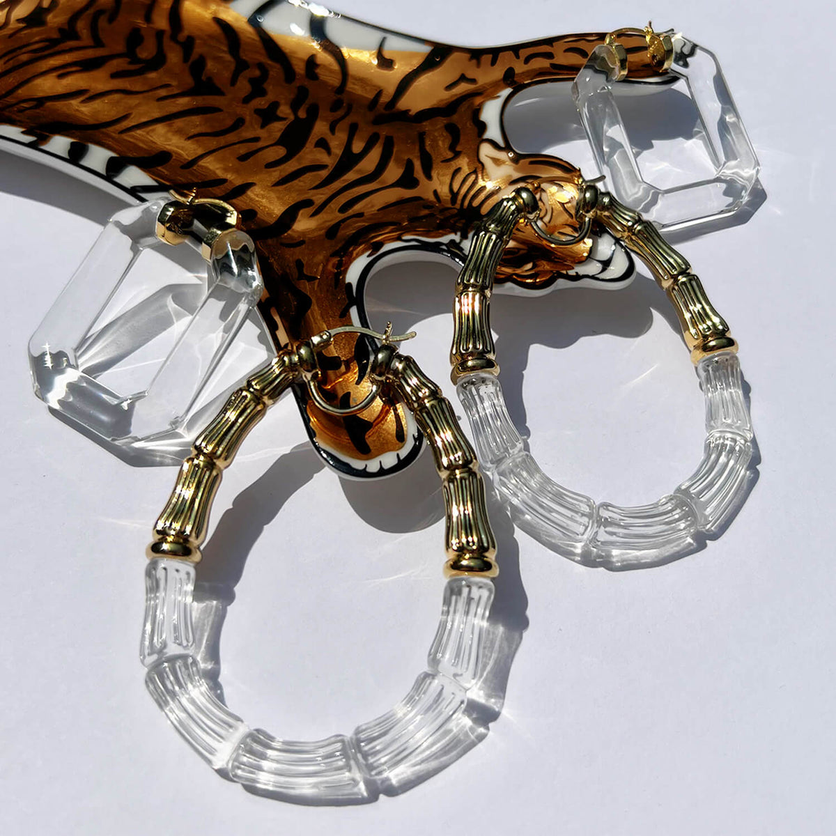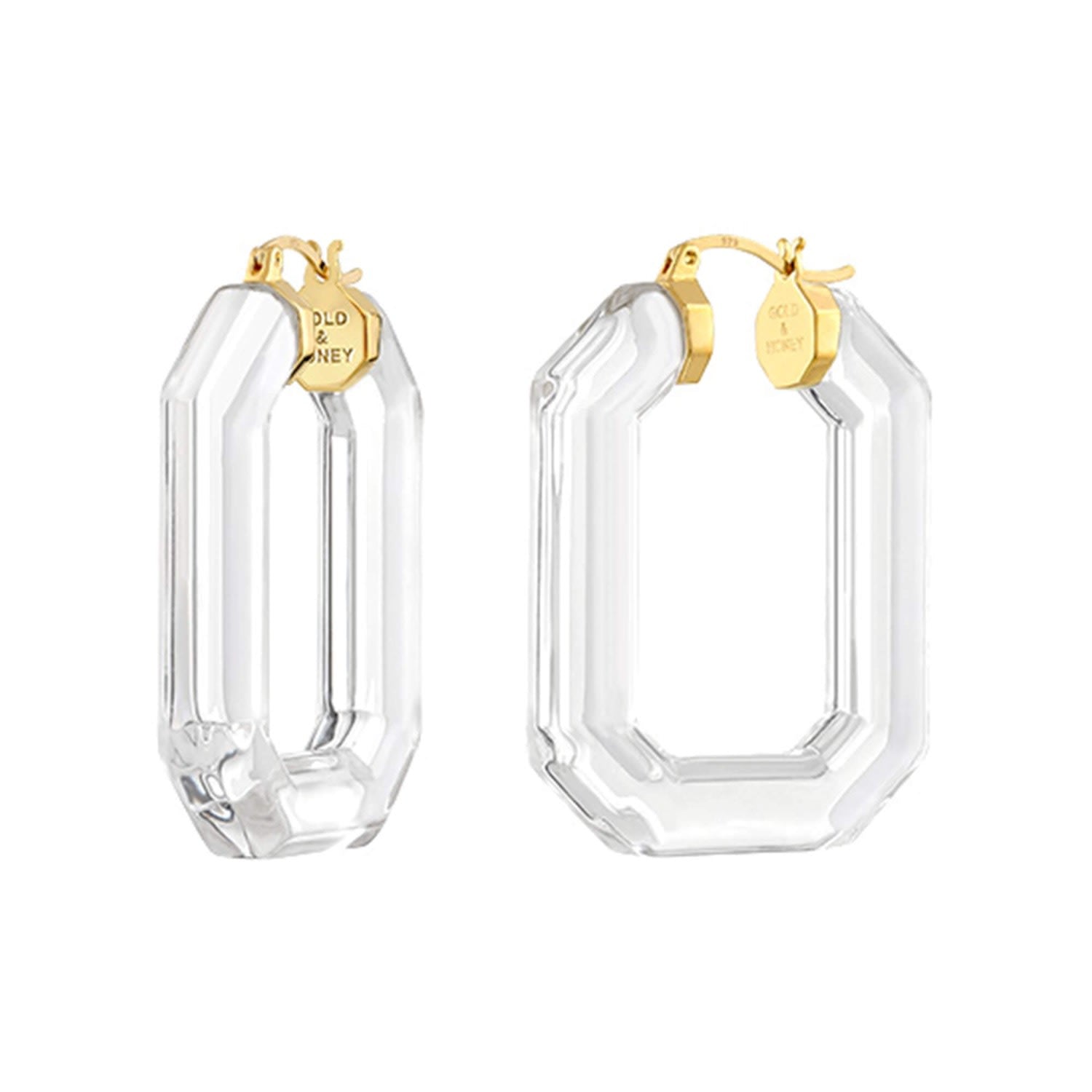 These hoops are handcrafted from lucite and have 14K gold plated sterling silver.