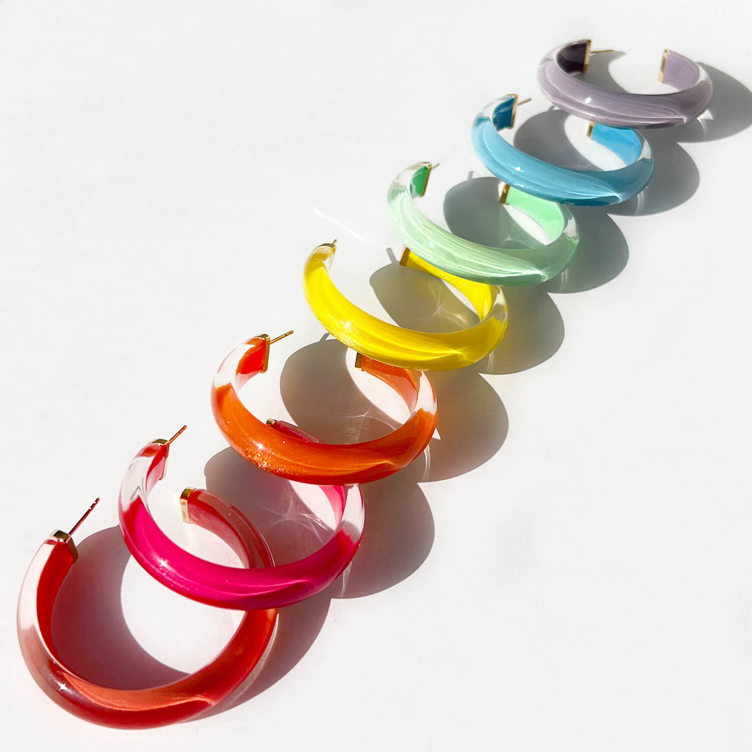 These hoops are handcrafted from lightweight lucite with hand-painted enamel and feature gold-plated sterling silver posts.
