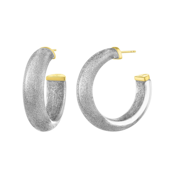 These hoops are handcrafted from lucite with hand-painted silver enamel and gold-plated sterling silver posts.