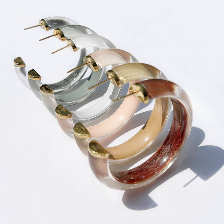 The Small Pixie Silver Illusion Hoop Earrings by Gold & Honey are a new addition to their Illusion Hoops collection. They are lightweight and offer a unique effect, appearing full-color from the front and clear from the side. They are handcrafted from lucite with hand-painted silver enamel and gold-plated sterling silver posts.