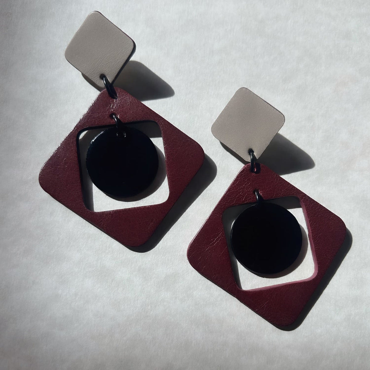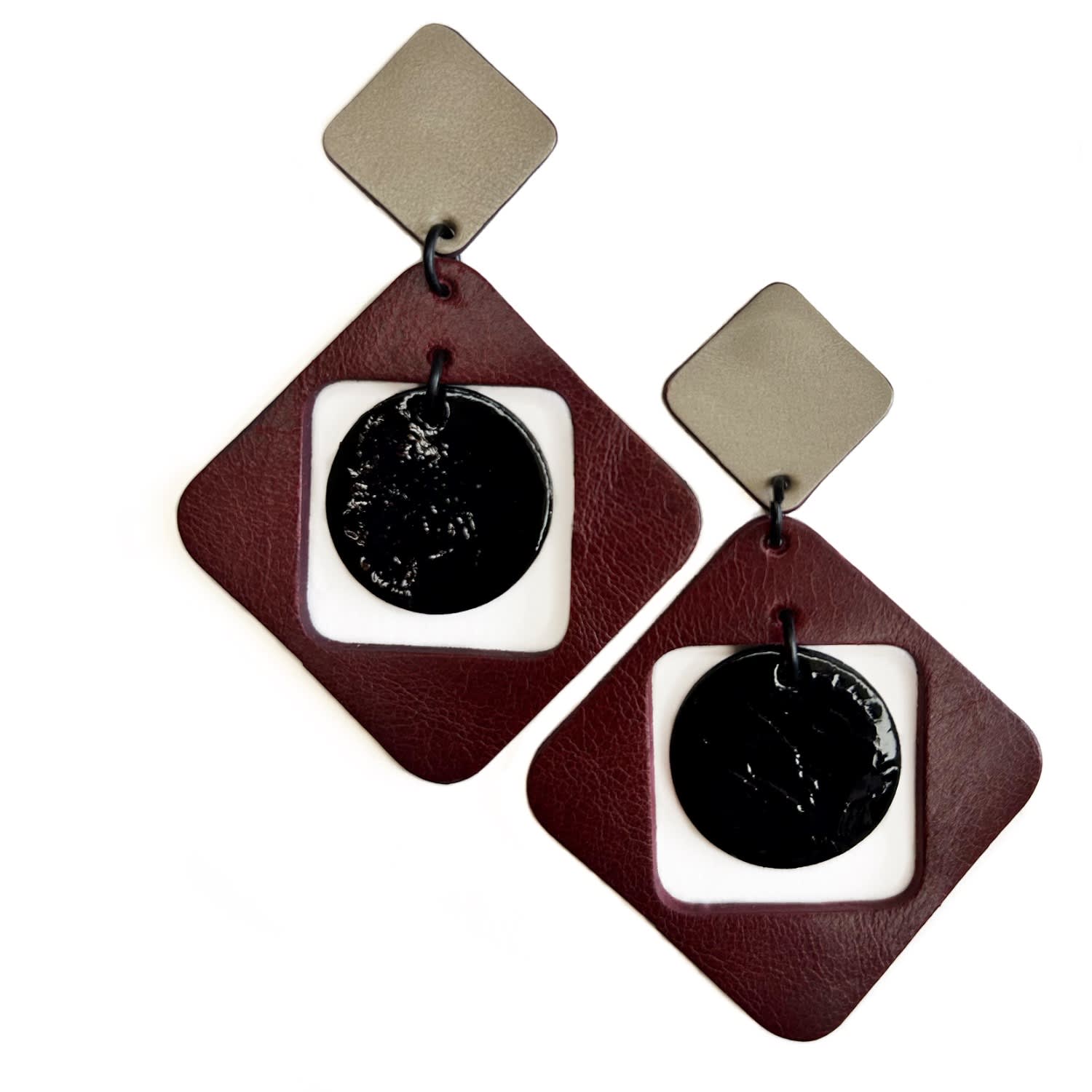 These earrings are crafted from upcycled leather and a black lacquered centerpiece.