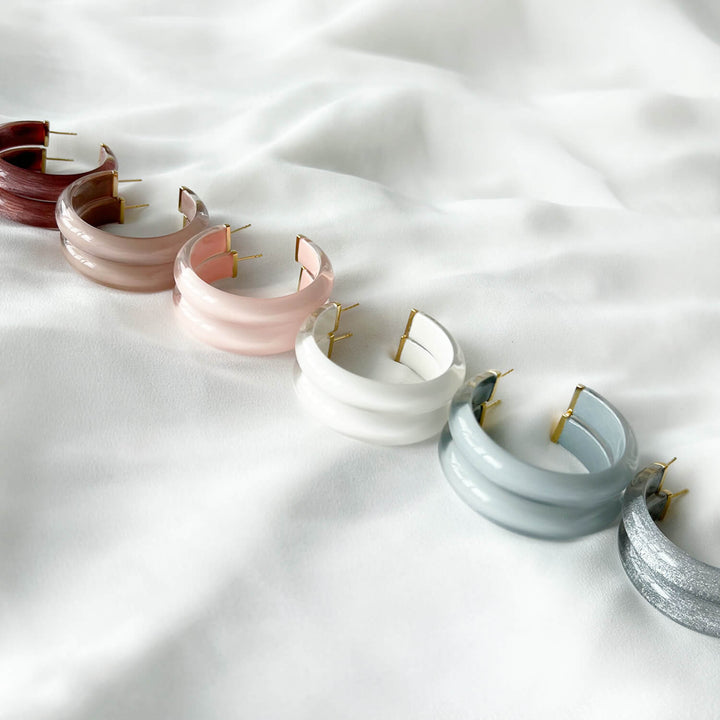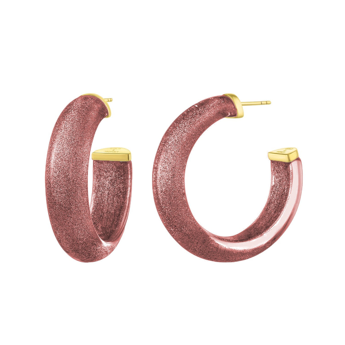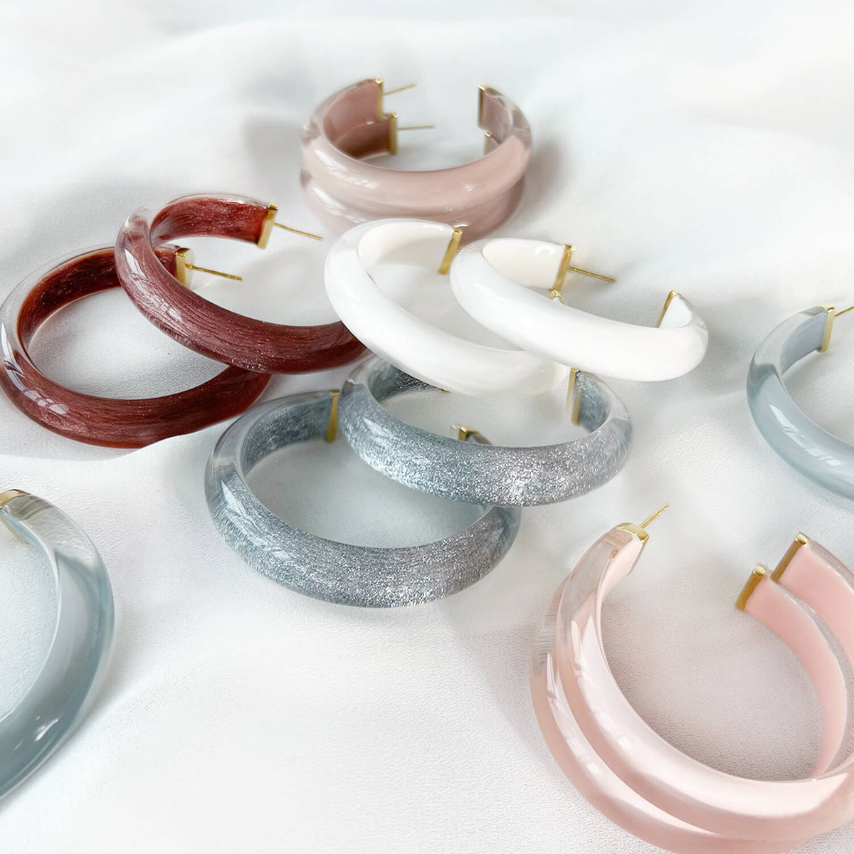 These hoops are handcrafted from lucite with hand-painted enamel and gold-plated sterling silver posts.