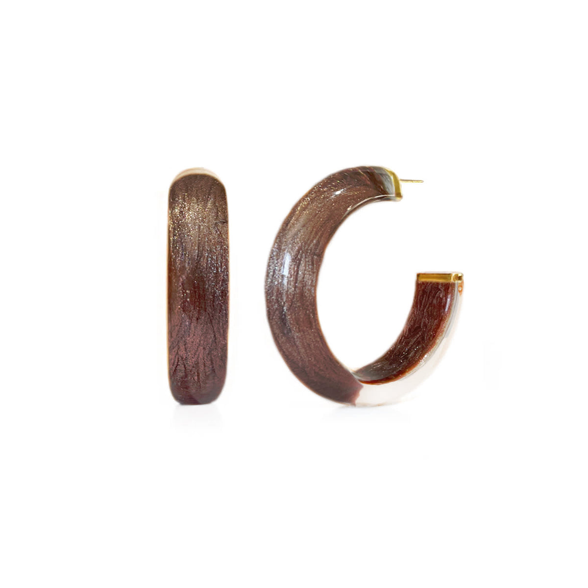 The Small Cocoa Brown Illusion Hoop Earrings by Gold & Honey are lightweight and stylish. Handcrafted from lucite with hand-painted enamel and gold-plated sterling silver posts, they provide a pop of color and shimmer.