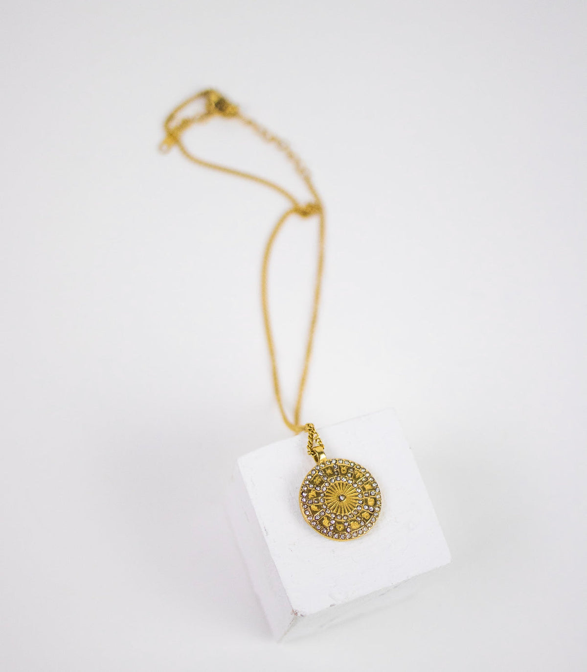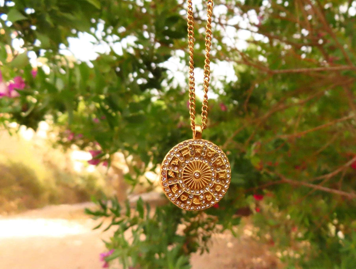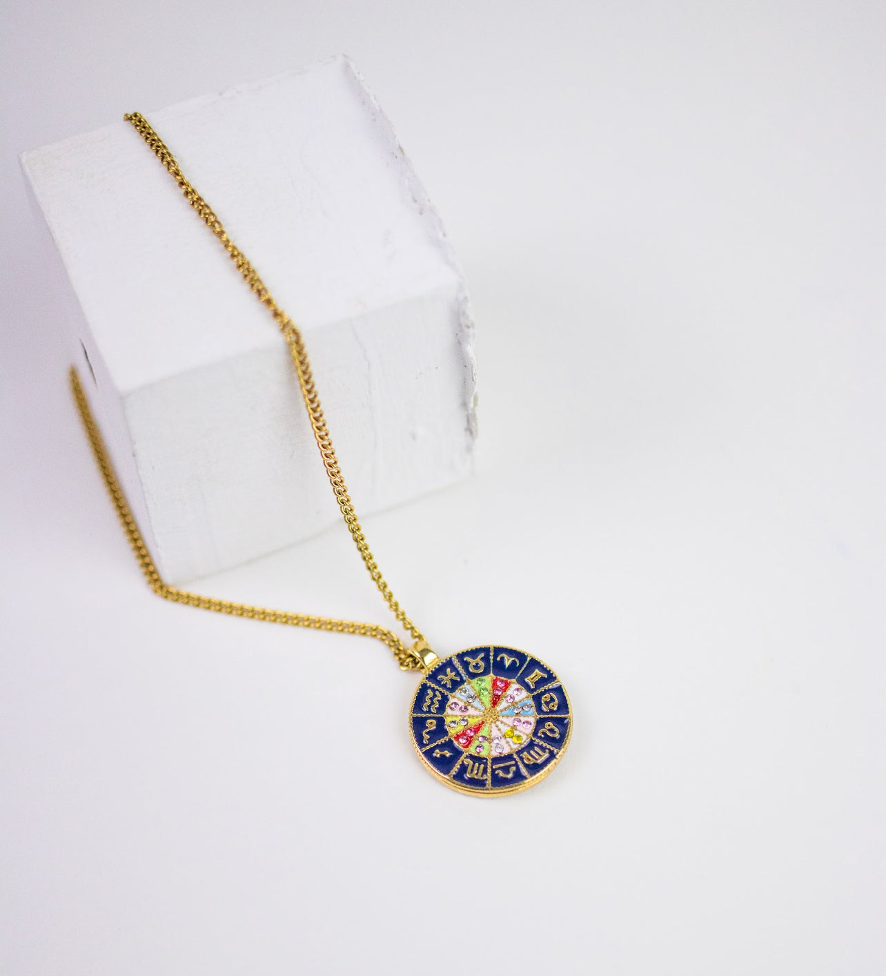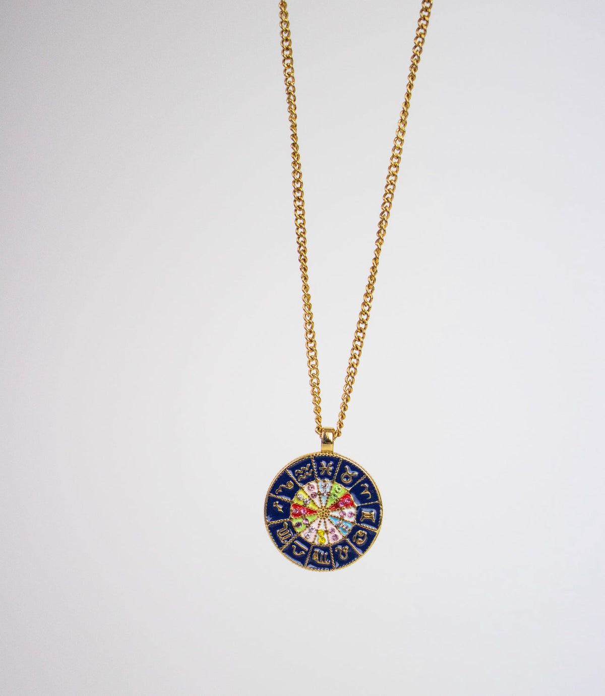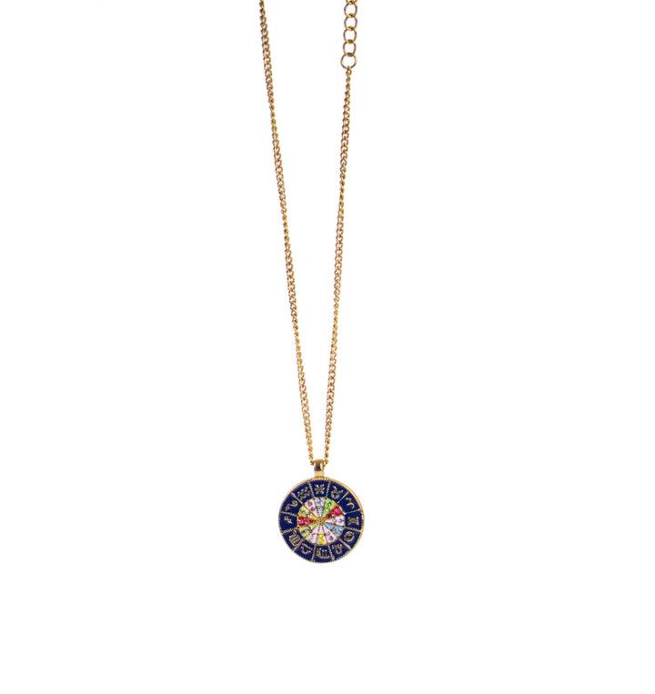 This Georgia's Horoscope Wheel by Recreation Jewels is a captivating and versatile necklace. This reversible pendant features a navy and gold design with twelve star signs, symbolizing spirituality and personal style. Adorned with multicolored gems that represent each zodiac sign, this necklace is perfect for everyday wear and all occasions. It adds cosmic energy and personal flair, making it an ideal gift for a loved one.