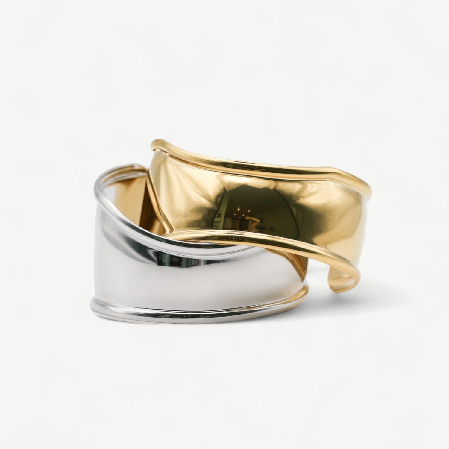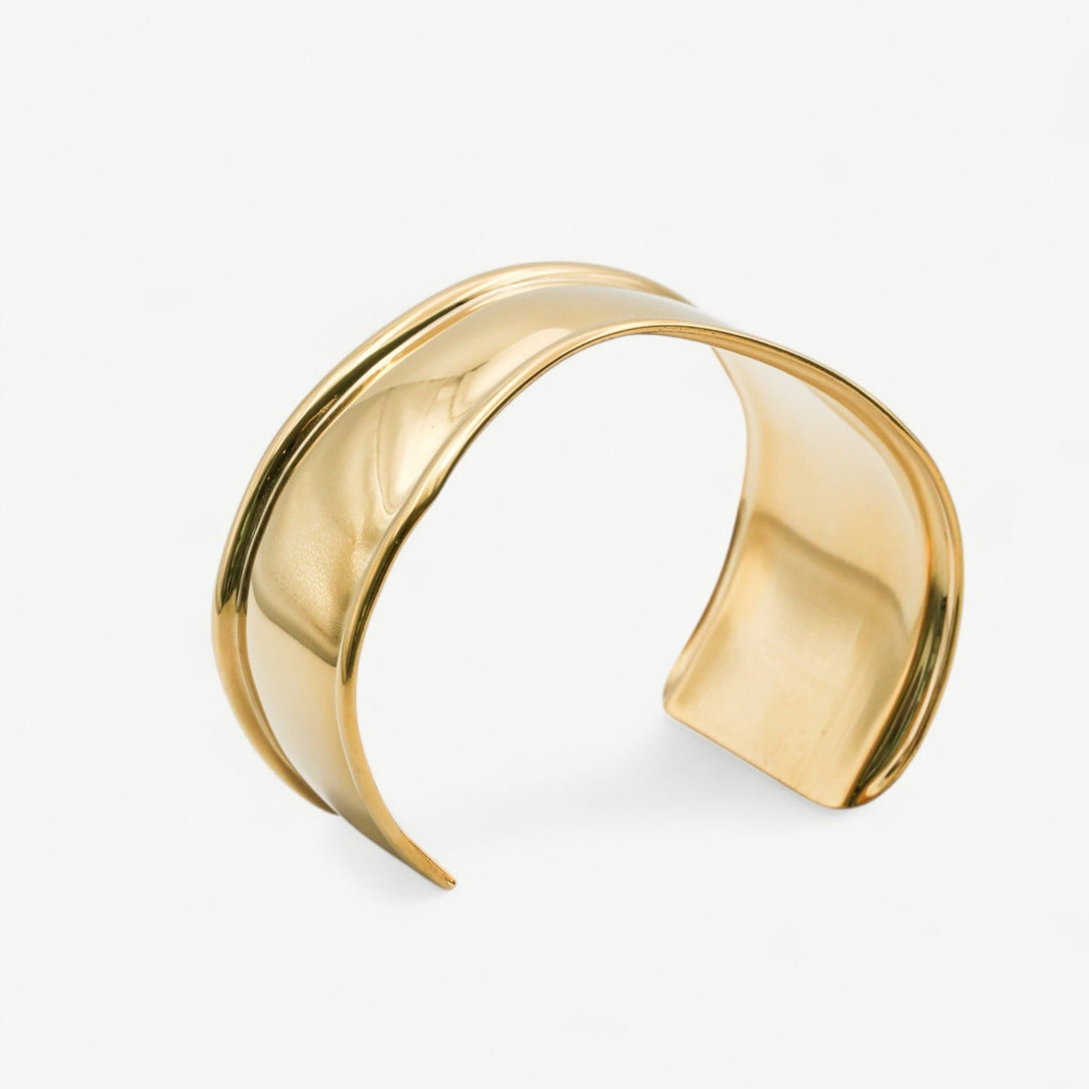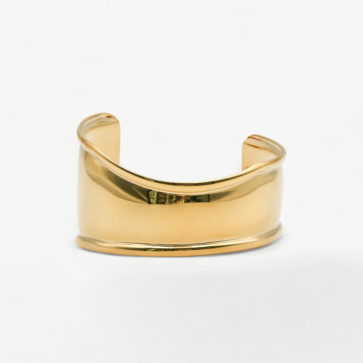 The Arc Cuff Bangle by Miss Cecilia embodies minimal architectural design with its clean, flowing curves that create a modern and sophisticated silhouette. Crafted from 18ct gold-plated stainless steel, this piece is designed to complement contemporary wardrobes, offering a subtle yet striking statement. The adjustable inner diameters ensure a comfortable fit, making this bangle a versatile and timeless accessory for those who appreciate refined simplicity and elegant design.