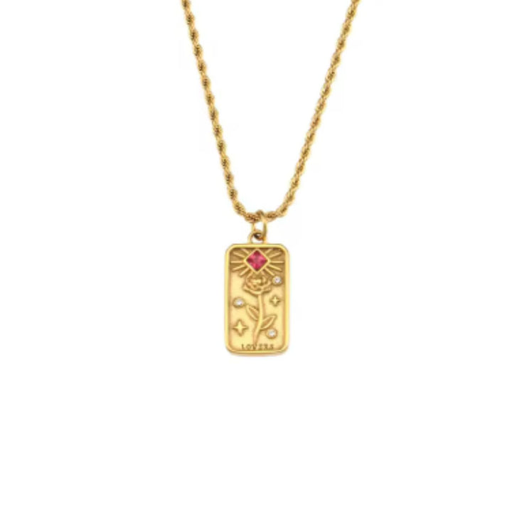 This necklace features a tarot card pendant crafted from stainless steel with 18K gold plating and a PVD coating. It is adorned with zircon stones and has a length of 50cm.