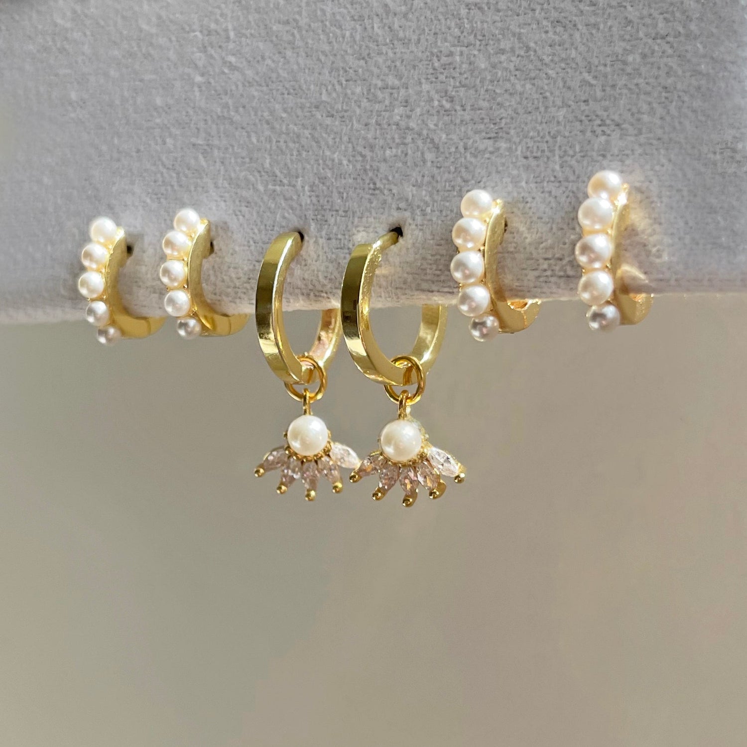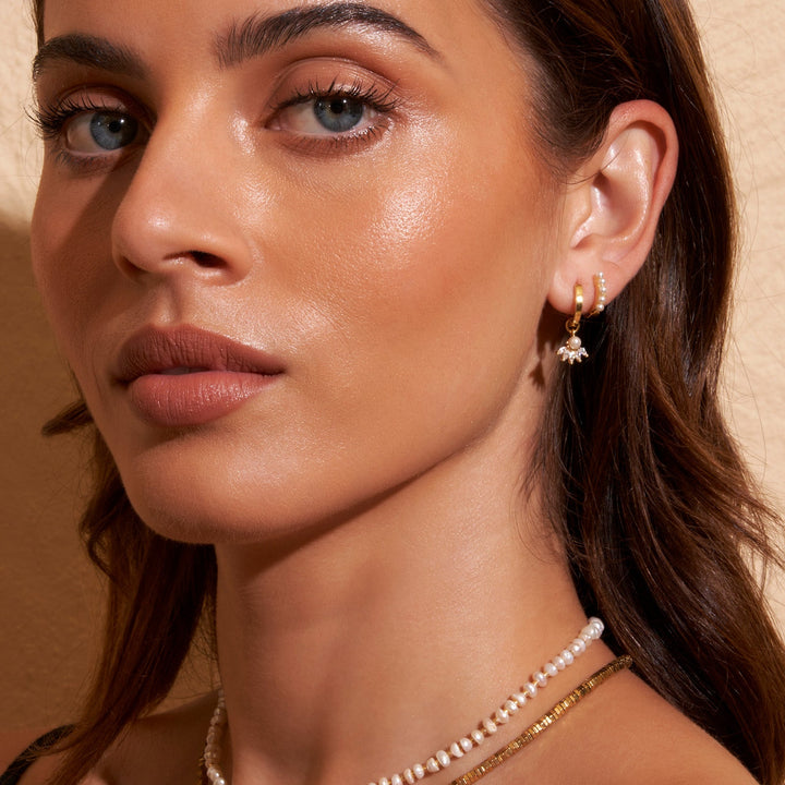 These earrings are crafted with 18k Gold plating (1 micron thick) over a Sterling Silver base. They feature freshwater pearls and are lead and nickel-free. The earrings measure 1.2cm.