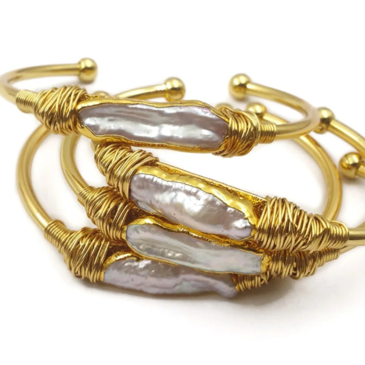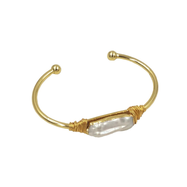 This bangle is plated in 18k gold and features a pearl stone. It has an adjustable design and is water-resistant.