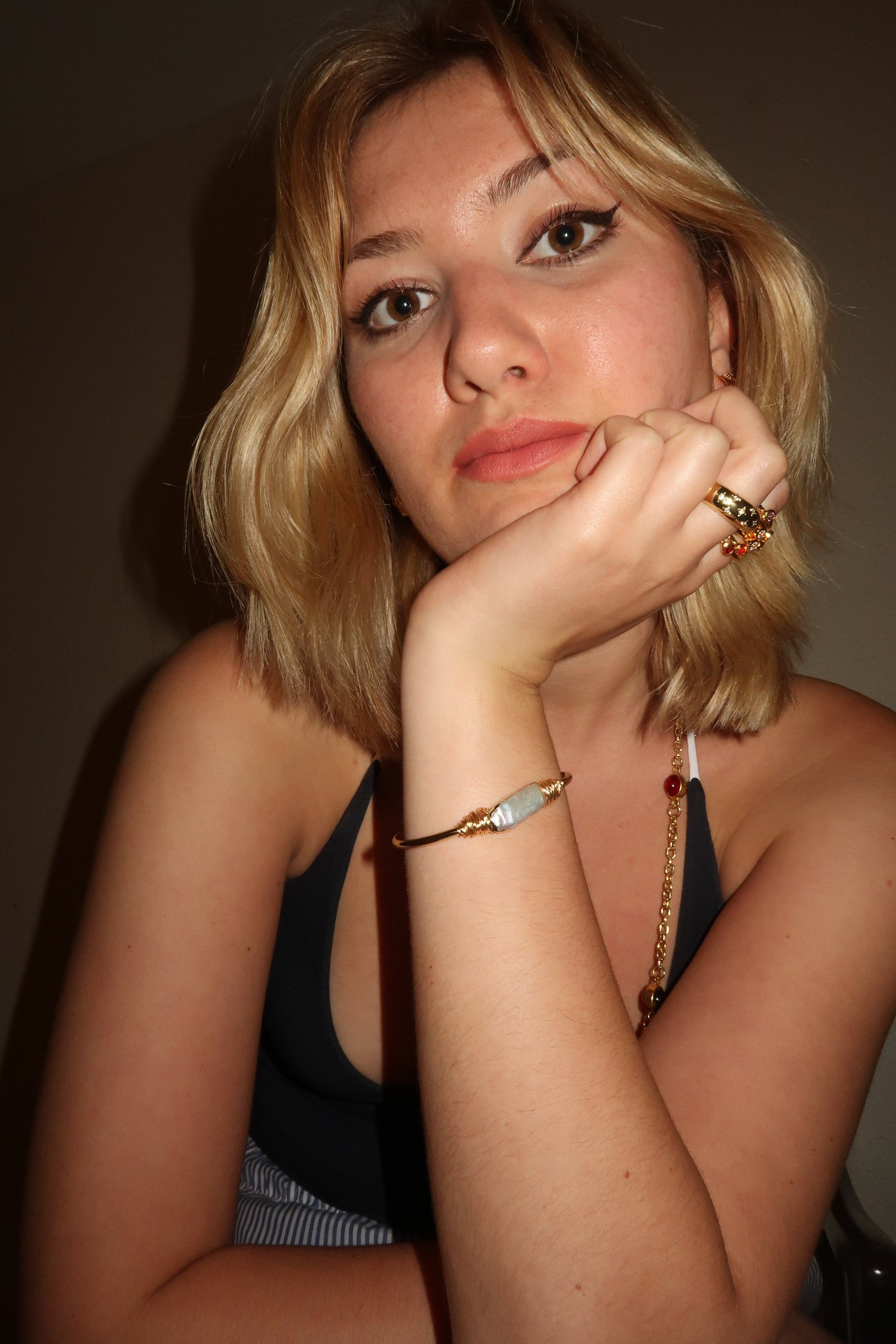 This Christina's Pearl Bangle by Recreation Jewels is an exquisite and elegant accessory that captures the essence of classic style. The bangle, plated in 18k gold, features a lustrous pearl stone that adds a touch of sophistication. Its adjustable and water-resistant design makes it perfect for everyday wear, offering a versatile piece for stacking or wearing alone.