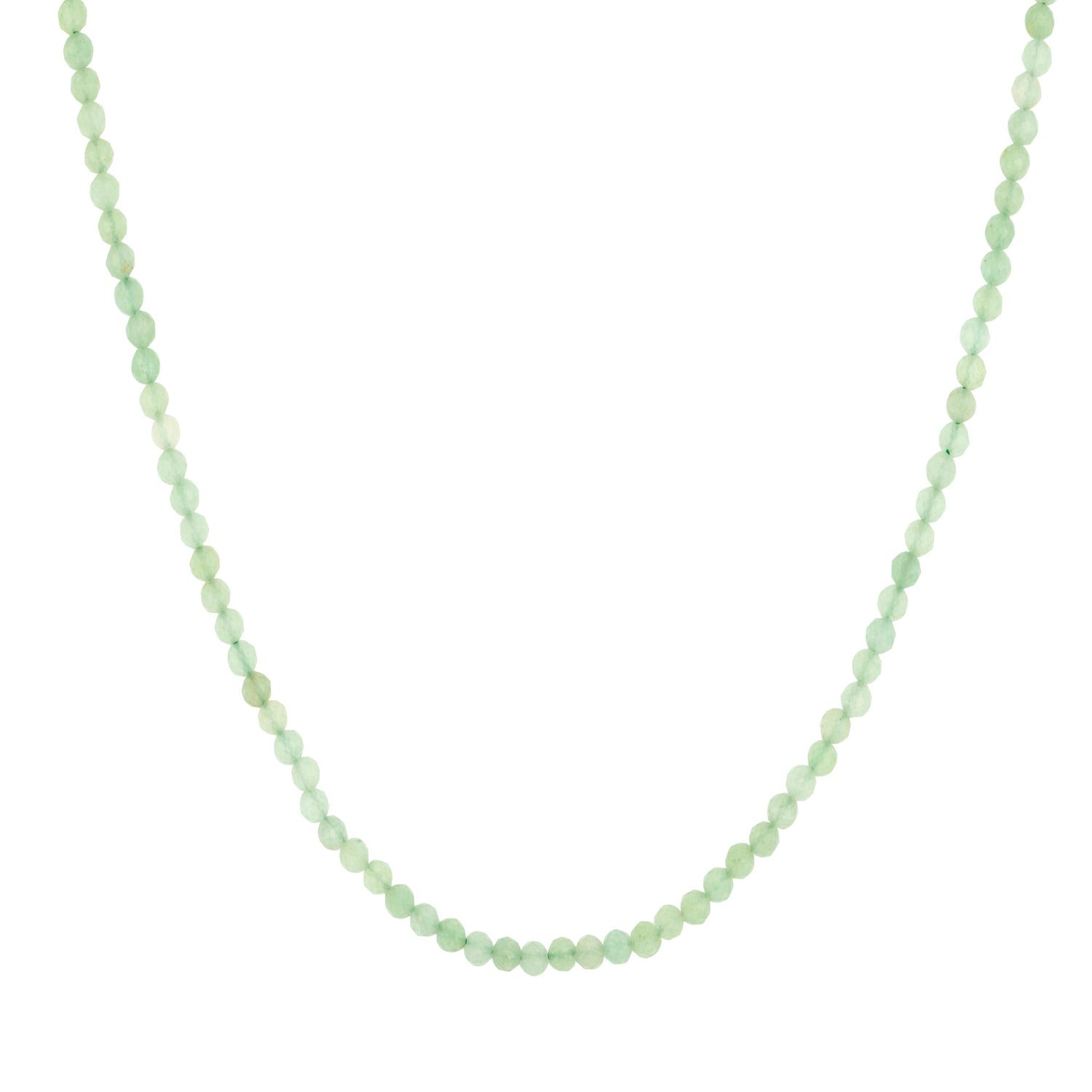 The Green Aventurine Beaded Necklace In Silver by Gold Trip is a contemporary and easy-to-wear necklace. It features faceted green aventurine stones hand-strung onto a wire for added sparkle. The necklace is secured with a sterling silver lobster clasp and an extension chain, making it perfect for wearing alone or layering.