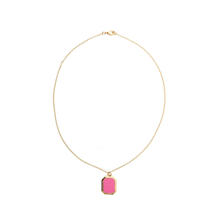 This necklace is crafted from enamel-plated gold with a pink finish. It is handmade in New York.