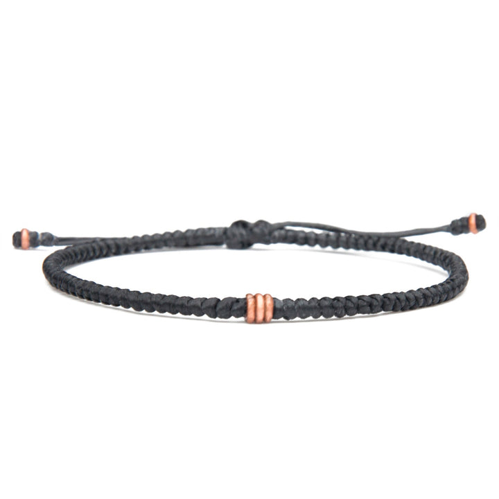 This bracelet is a solid copper rounded band with a black finish. It is handmade and waterproof.
