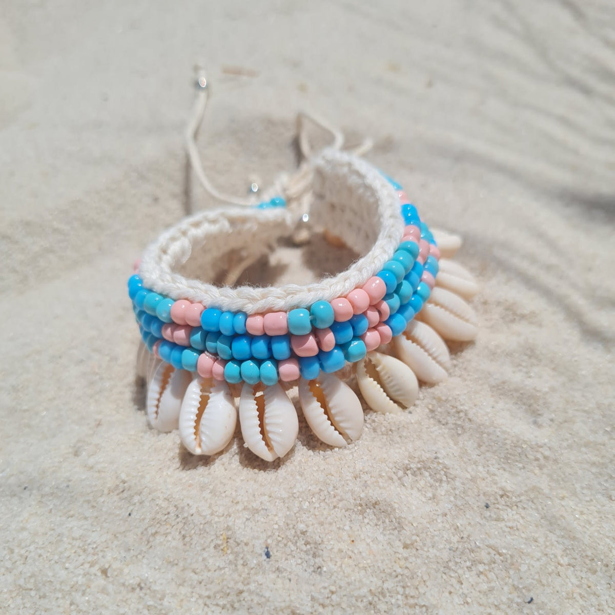 This bracelet is handmade with 60% cotton macrame, 30% real cowrie shells, and 10% decorative beads. It is adjustable and features a sunrise color palette.