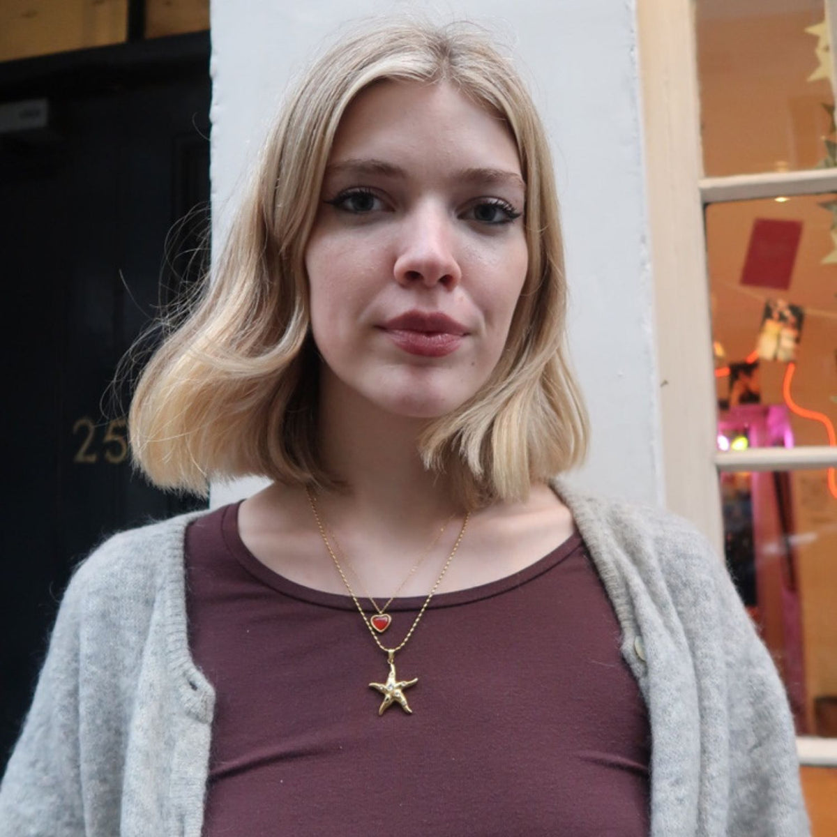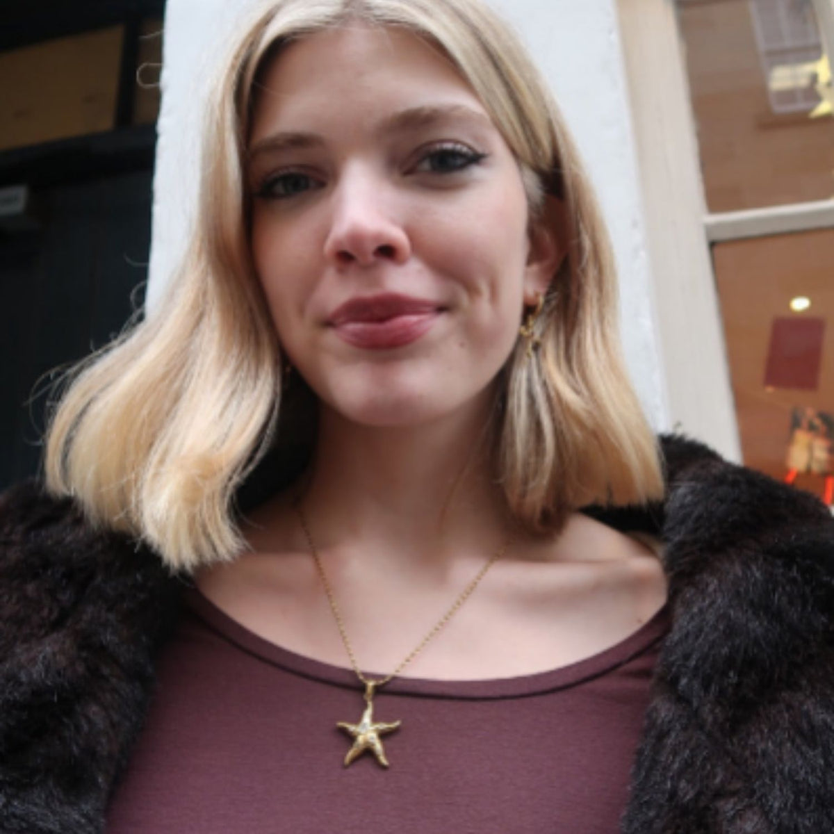 This Pim's Starfish Necklace In White by Recreation Jewels features a beautifully textured starfish pendant, capturing the ocean's beauty in a timeless design. The pendant is adorned with shimmering zircon stones, adding a touch of sparkle that evokes the feeling of sunlight on water. This necklace is a playful and sophisticated symbol of seaside tranquility and freedom, perfect for those who want to carry a piece of the ocean with them.