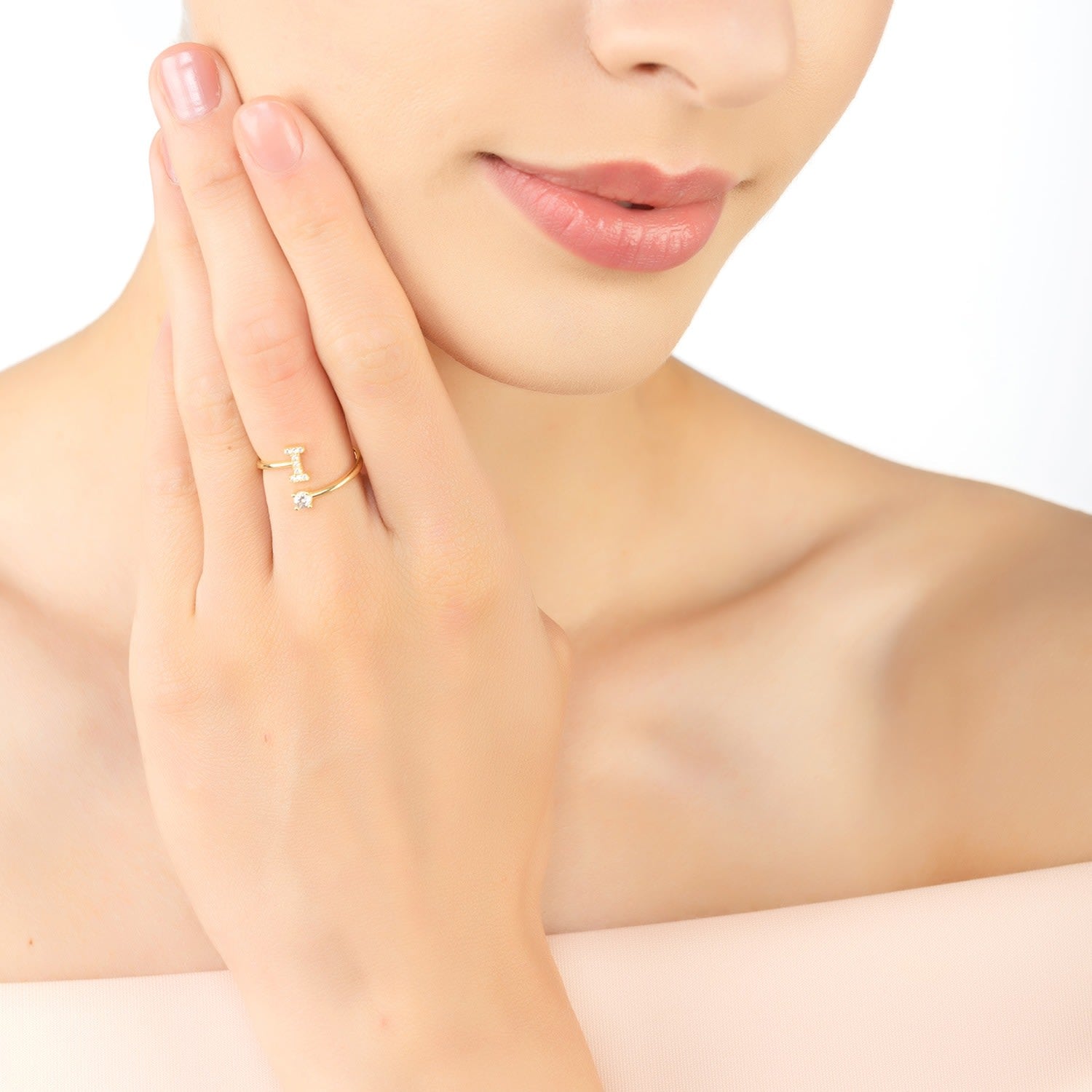 This Initial Ring Gold I by Latelita is a delicate and personal accessory that adds a sophisticated finishing touch to any outfit. The open band allows for a slight adjustment, with a zircon-adorned monogram 'I' on one side and a single, larger cubic zirconia on the other, giving it a hint of sparkle. It's a great piece to stack with other rings, and it's a perfect and thoughtful gift for someone special.