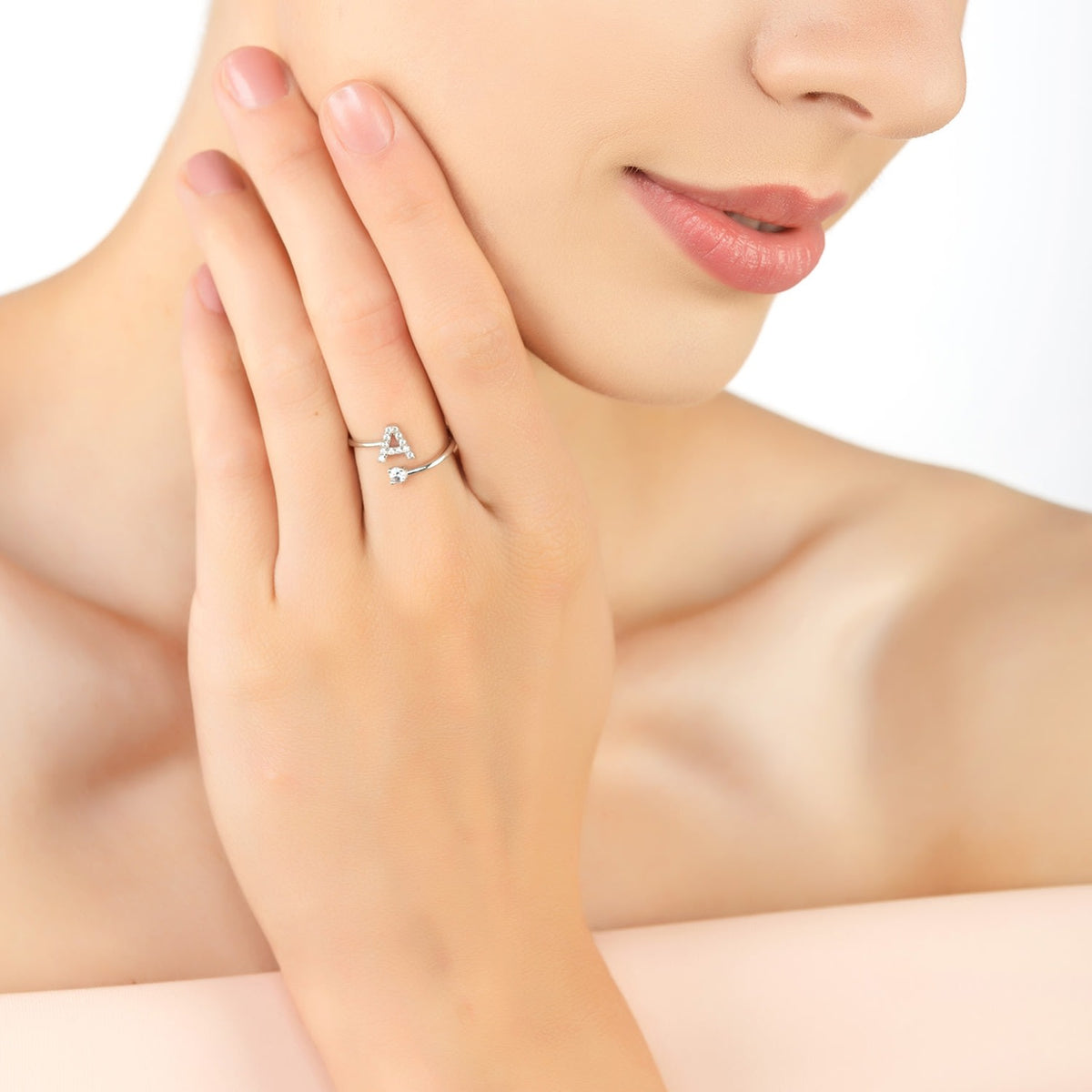 This Initial Ring Silver A by Latelita is a simple yet beautifully styled accessory that adds a hint of sparkle and a sophisticated finishing touch to any outfit. The open band allows for a slight adjustability, and it looks great when stacked with other rings. The monogram, adorned with zircons and a single cubic zirconia, makes it a perfect, personalized gift.