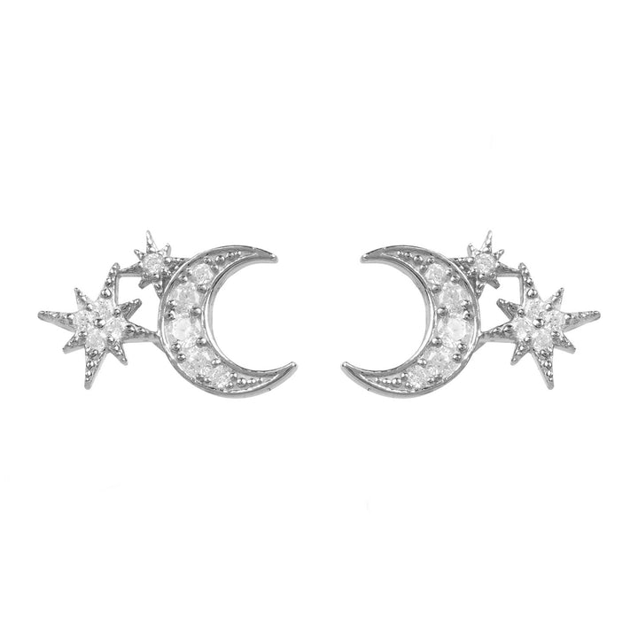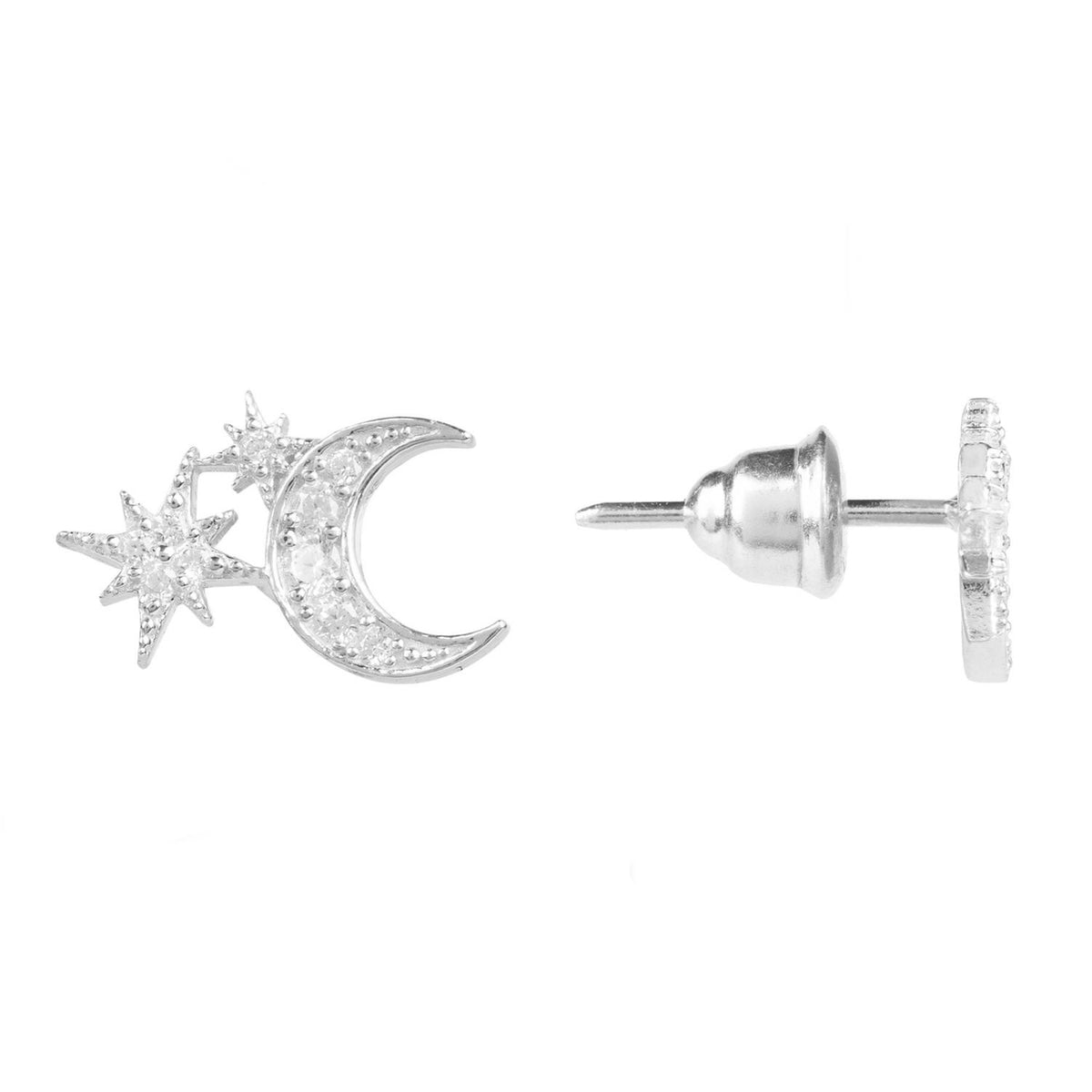 These Moon & Starburst Small Stud Earrings Silver by Latelita are a whimsical and versatile accessory perfect for adding a touch of celestial charm to your look. The set features a petite crescent moon and two ascending stars, all adorned with Latelita's signature sparkling white zircons. The playful yet elegant design allows these earrings to be worn with everything from professional office attire to a classic evening dress. This set makes a great pairing with a matching moon and star necklace.