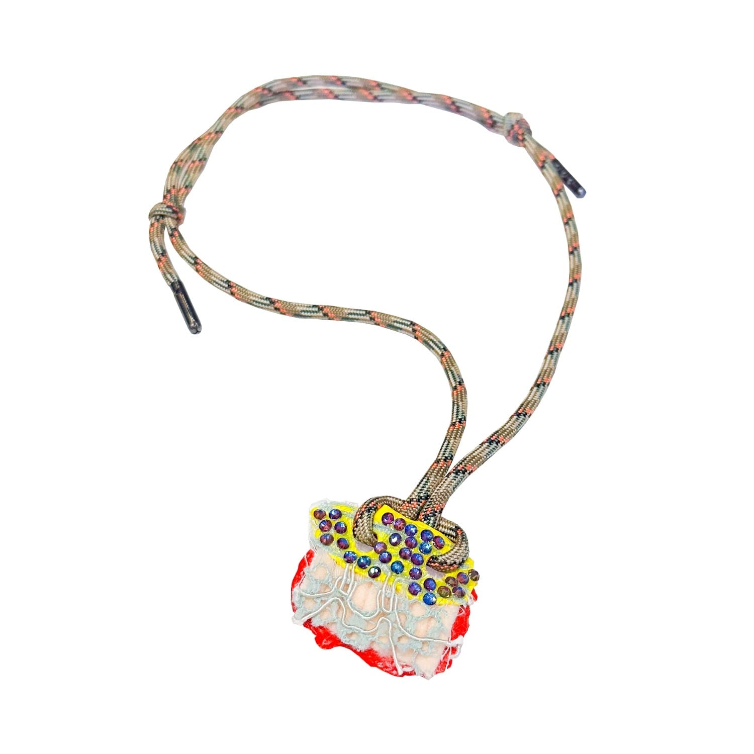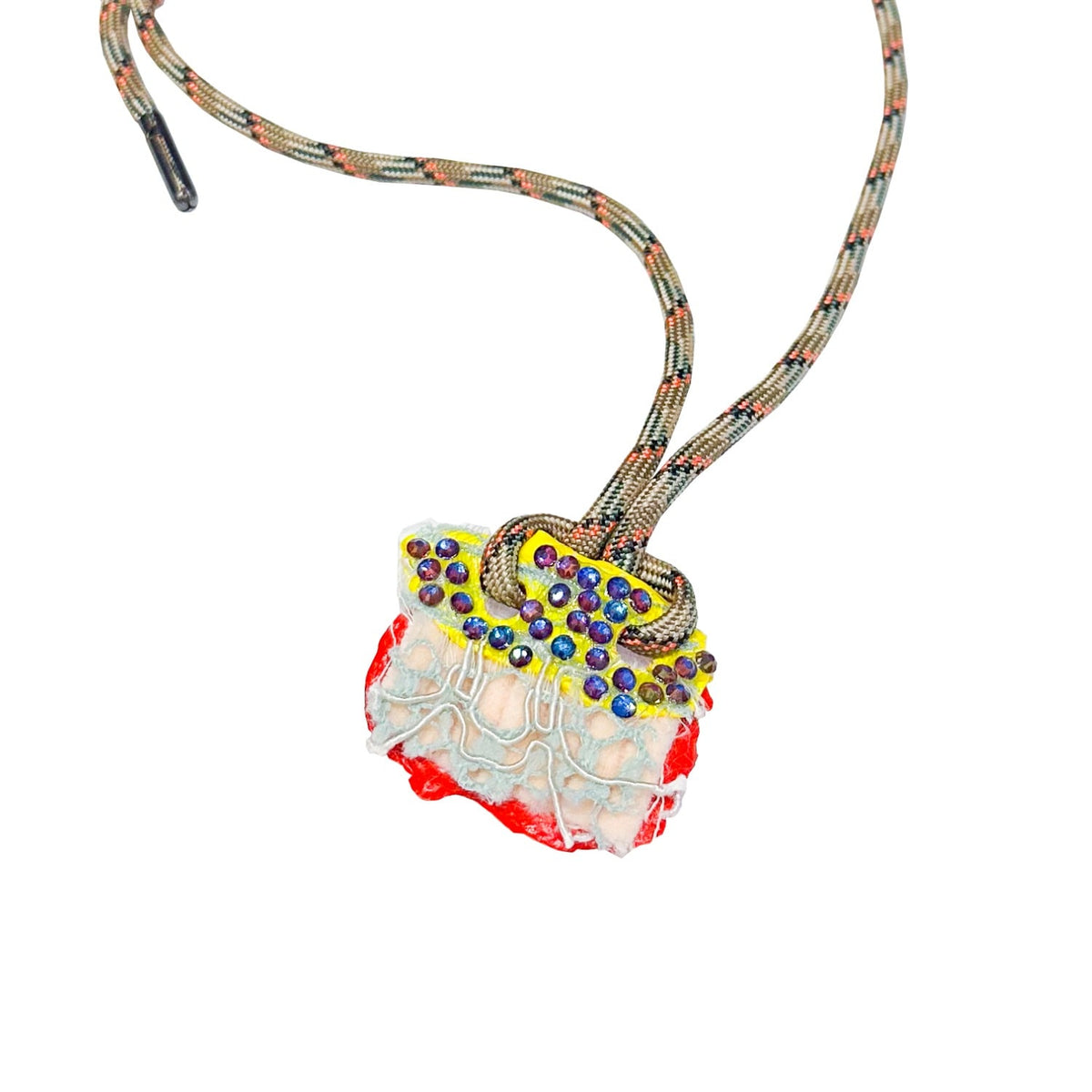 This handmade necklace is crafted from mixed materials, including paracord, fabric, acrylic paint, glass rhinestones, and metal.