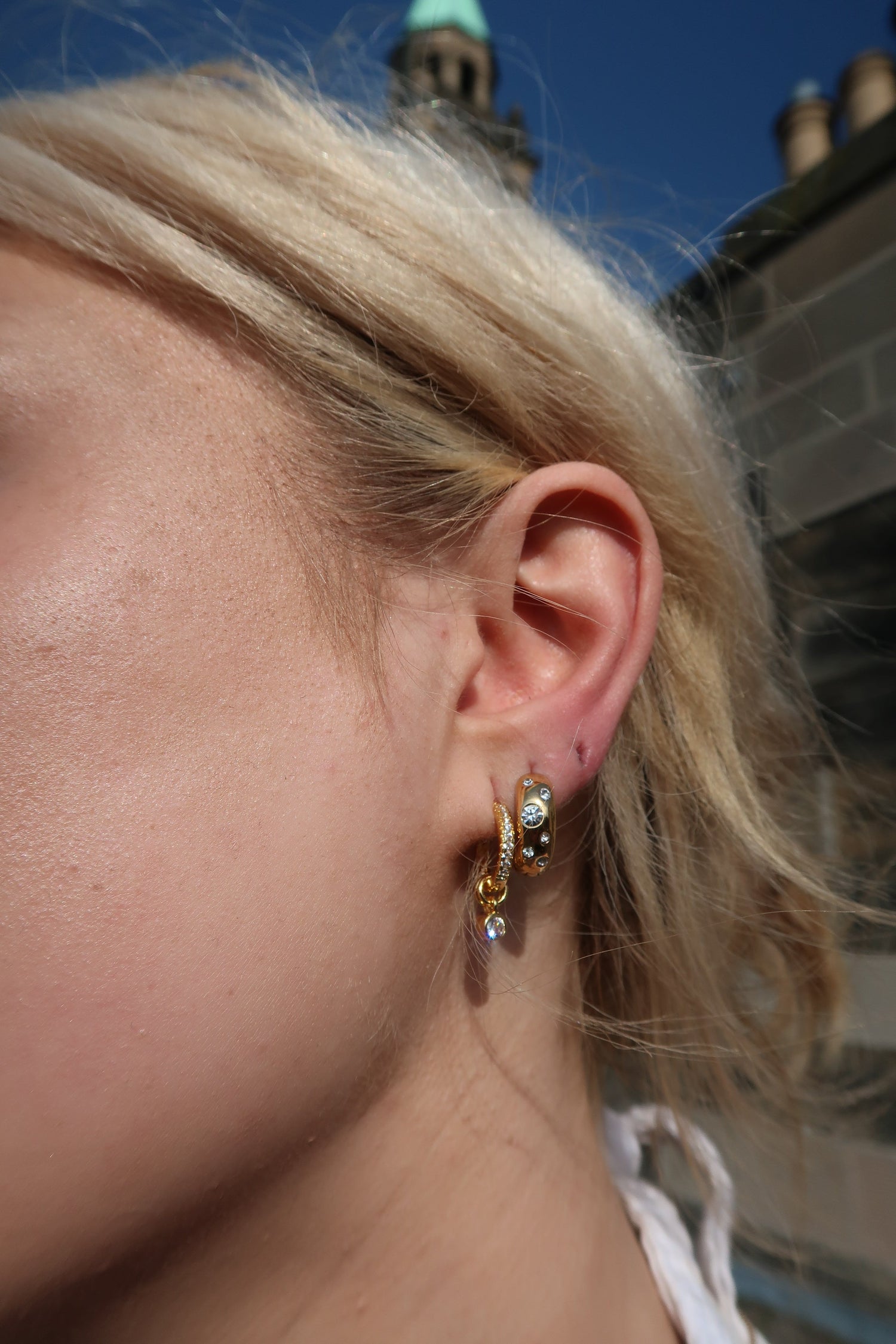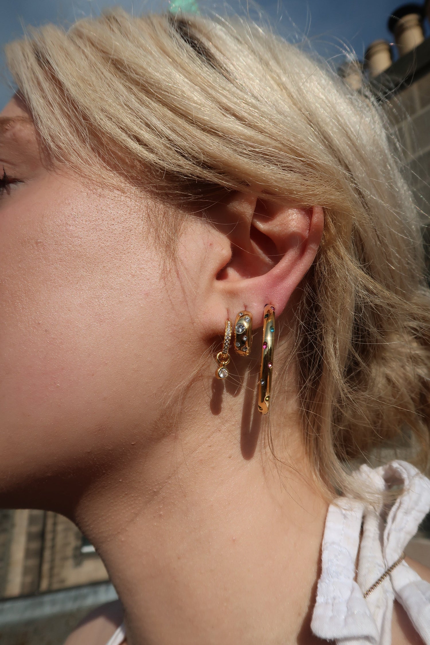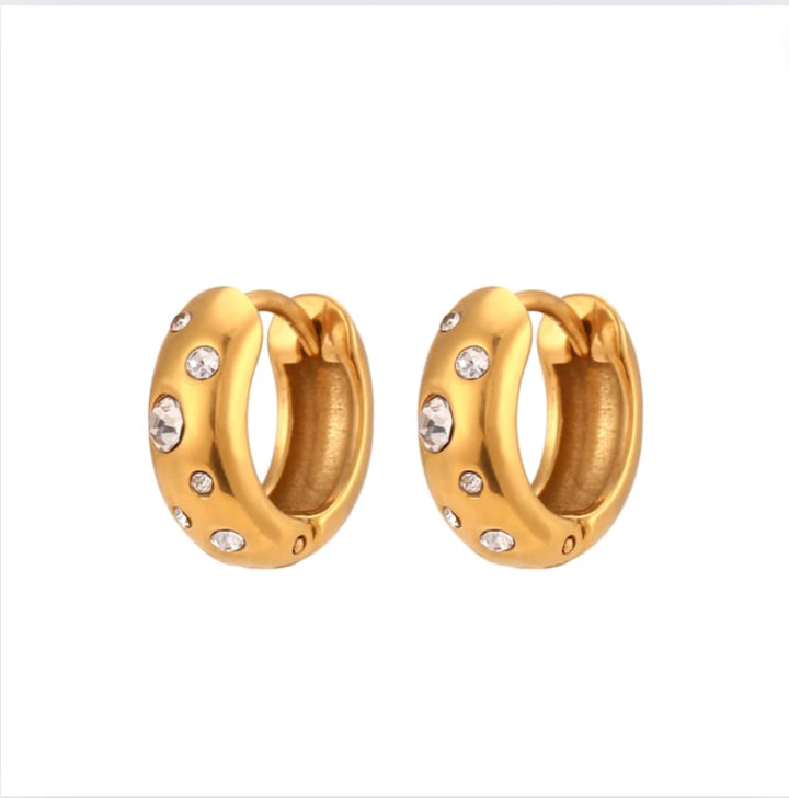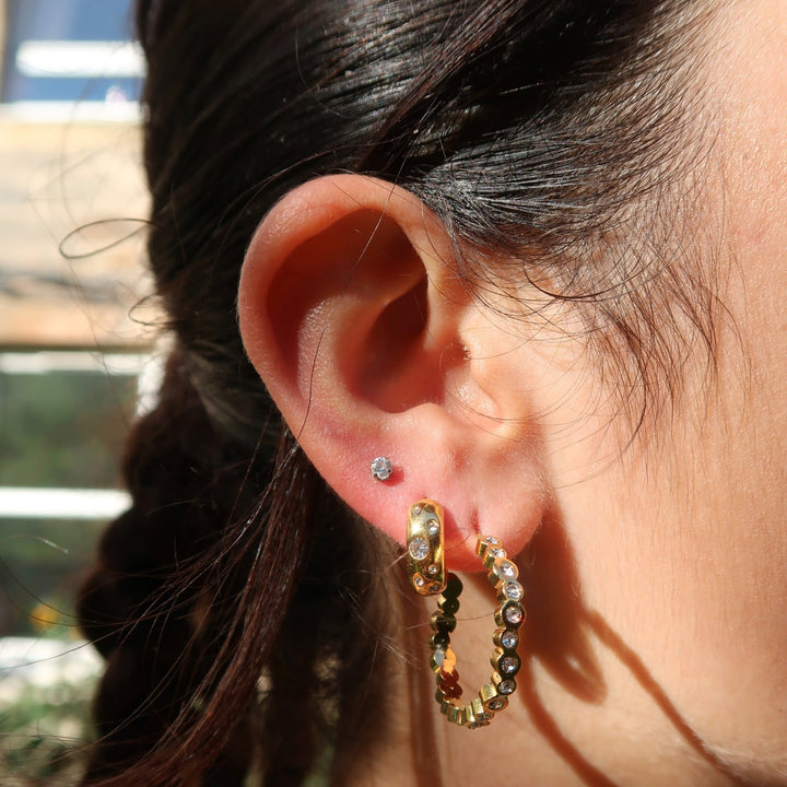 These huggie hoops are crafted from waterproof and hypoallergenic 316L stainless steel with a premium 18k gold plating. They are set with white emeralds.