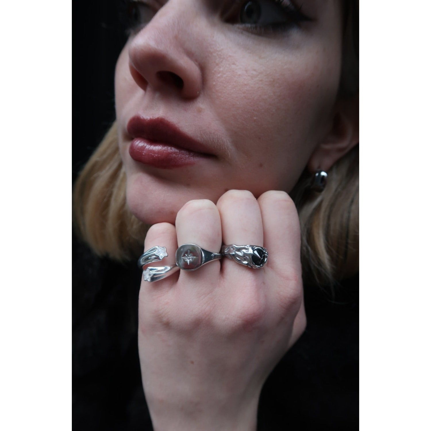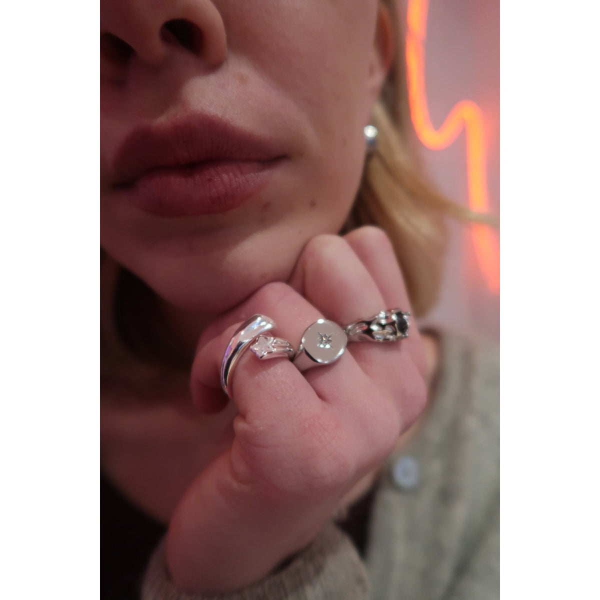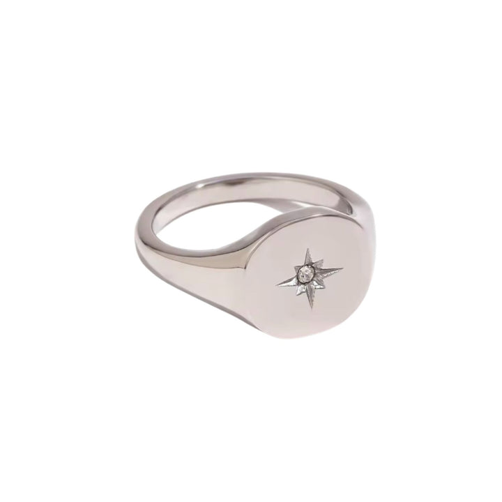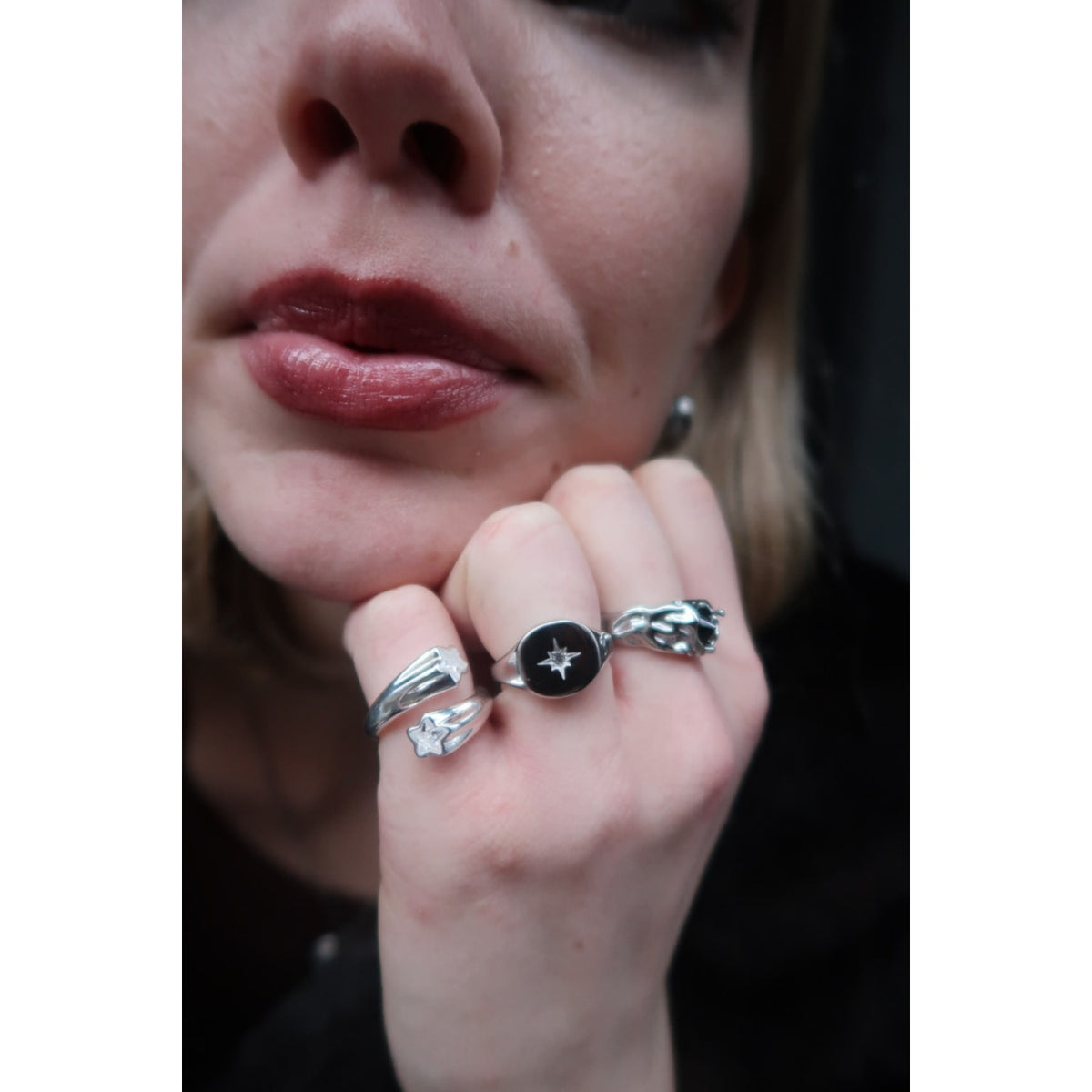 This Hailey's Star Ring by Recreation Jewels is a unique and striking accessory. It features a white gemstone in the center, crafted with high-quality 316L stainless steel for both luxury and longevity. The ring is waterproof and hypoallergenic, combining style and comfort for a must-have addition to your collection. It is a bold and modern piece that adds a touch of edgy elegance to any look.