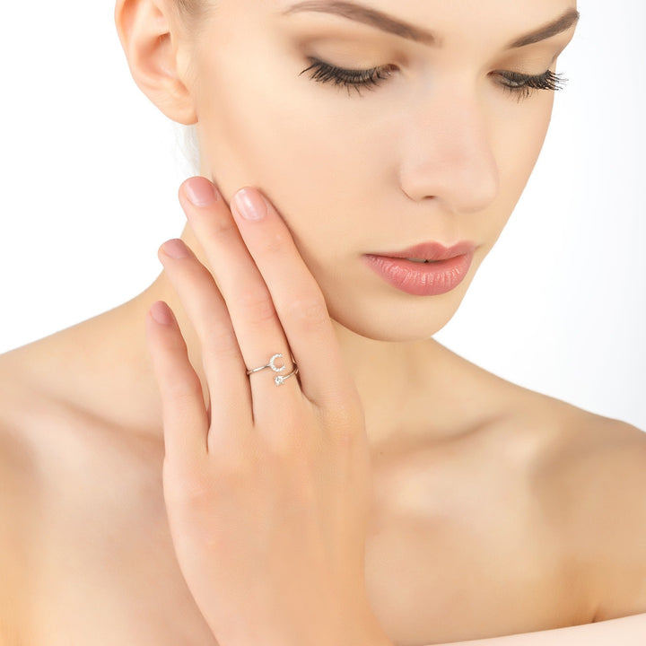 This Initial Ring Silver C by Latelita is a simple yet beautifully styled accessory that adds a hint of sparkle and a sophisticated finishing touch to any outfit. The open band allows for a slight adjustability, and it looks great when stacked with other rings. The monogram, adorned with zircons and a single cubic zirconia, makes it a perfect, personalized gift.