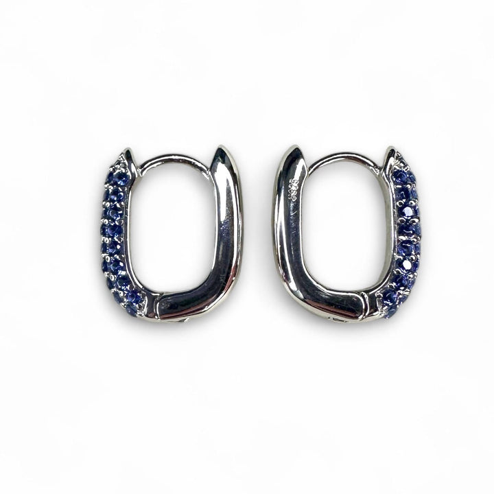 Oval Pave Gemstone Silver Huggie Earrings - Sapphire Blue