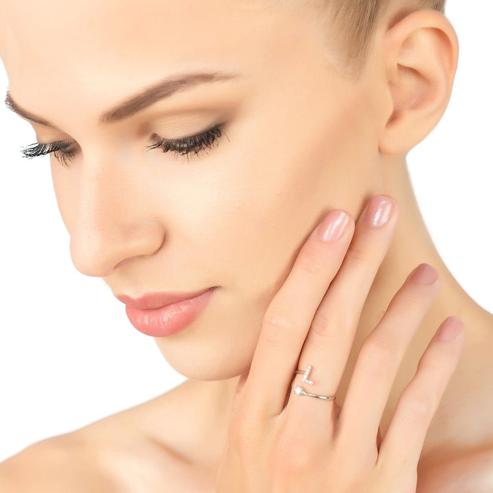 This ring is handcrafted from 925 sterling silver. It features white cubic zirconia and has an open band for adjustability.