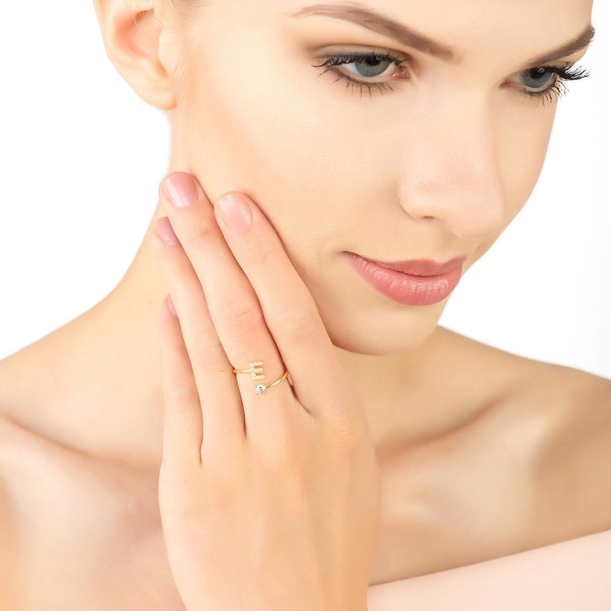 This Initial Ring Gold E by Latelita is a delicate and personal accessory that adds a sophisticated finishing touch to any outfit. The open band allows for a slight adjustment, with a zircon-adorned monogram 'E' on one side and a single, larger cubic zirconia on the other, giving it a hint of sparkle. It's a great piece to stack with other rings, and it's a perfect and thoughtful gift for someone special.