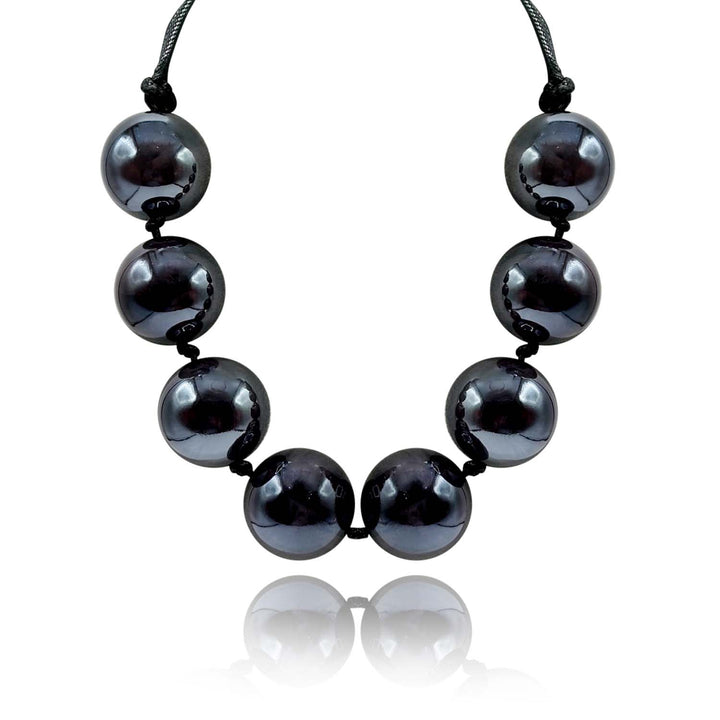 This necklace features 30mm knotted resin beads in a marbled black-hematite color. It has an adjustable clasp and can be worn from 14.5 to 20 inches in length.