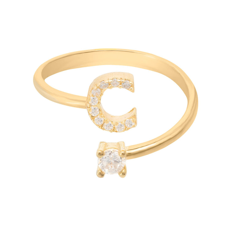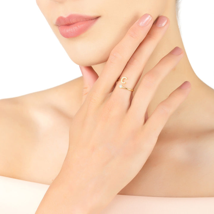 This Initial Ring Gold C by Latelita is a delicate and personal accessory that adds a sophisticated finishing touch to any outfit. The open band allows for a slight adjustment, with a zircon-adorned monogram 'C' on one side and a single, larger cubic zirconia on the other, giving it a hint of sparkle. It's a great piece to stack with other rings, and it's a perfect and thoughtful gift for someone special.