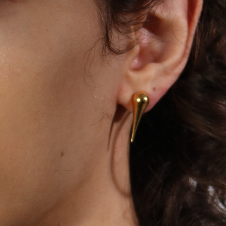 These single stud earrings are crafted from nickel-free brass with 23k gold plating and have surgical steel posts. They feature a modernist droplet design.