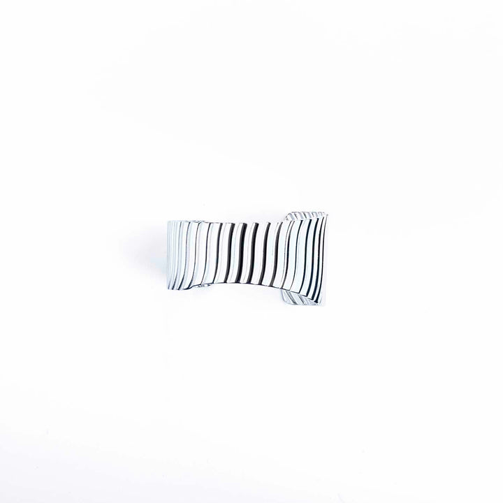 This cuff is a silver-finished piece with a radiant shine and textured lines. The specific metal is not listed, but it is a "luxe silver finish."