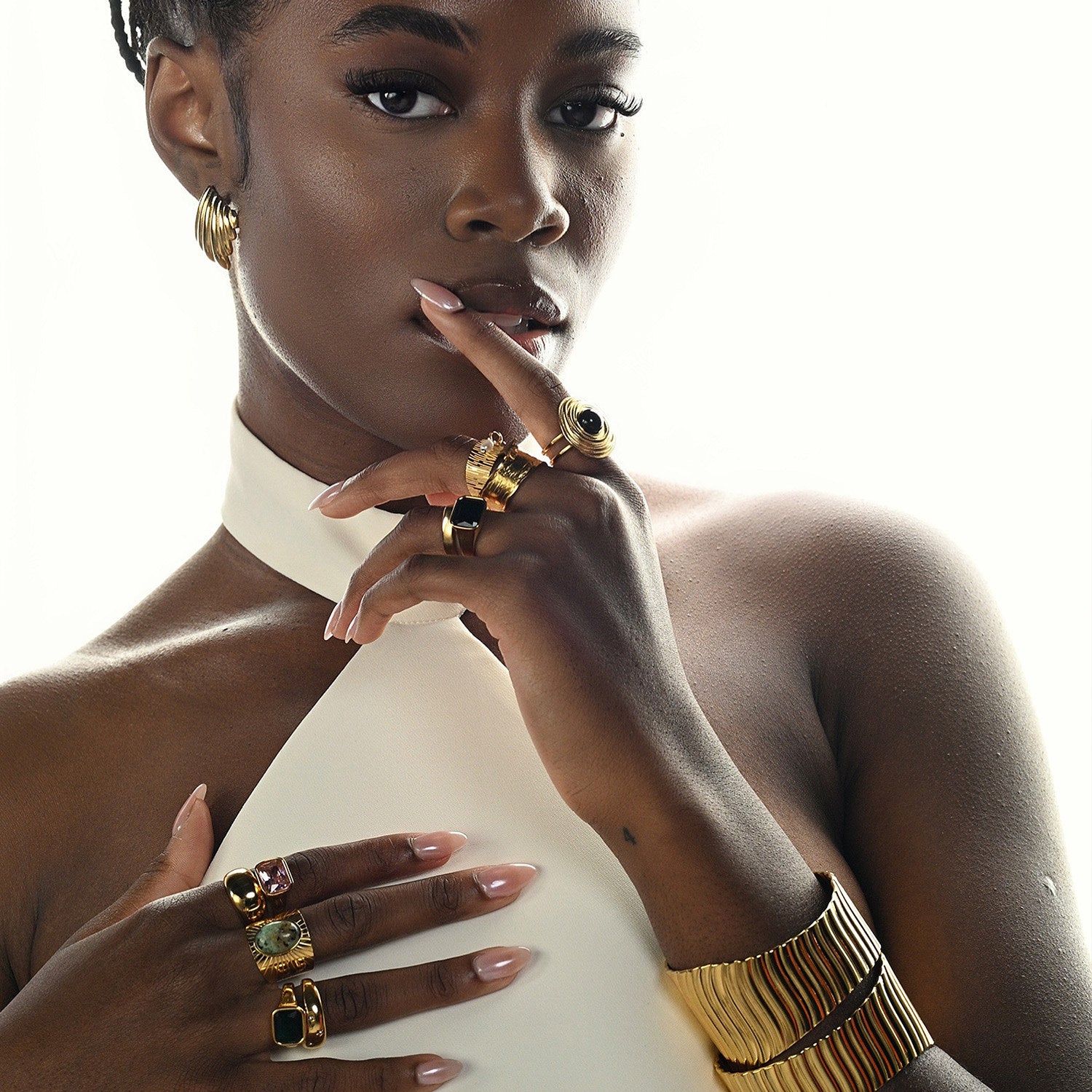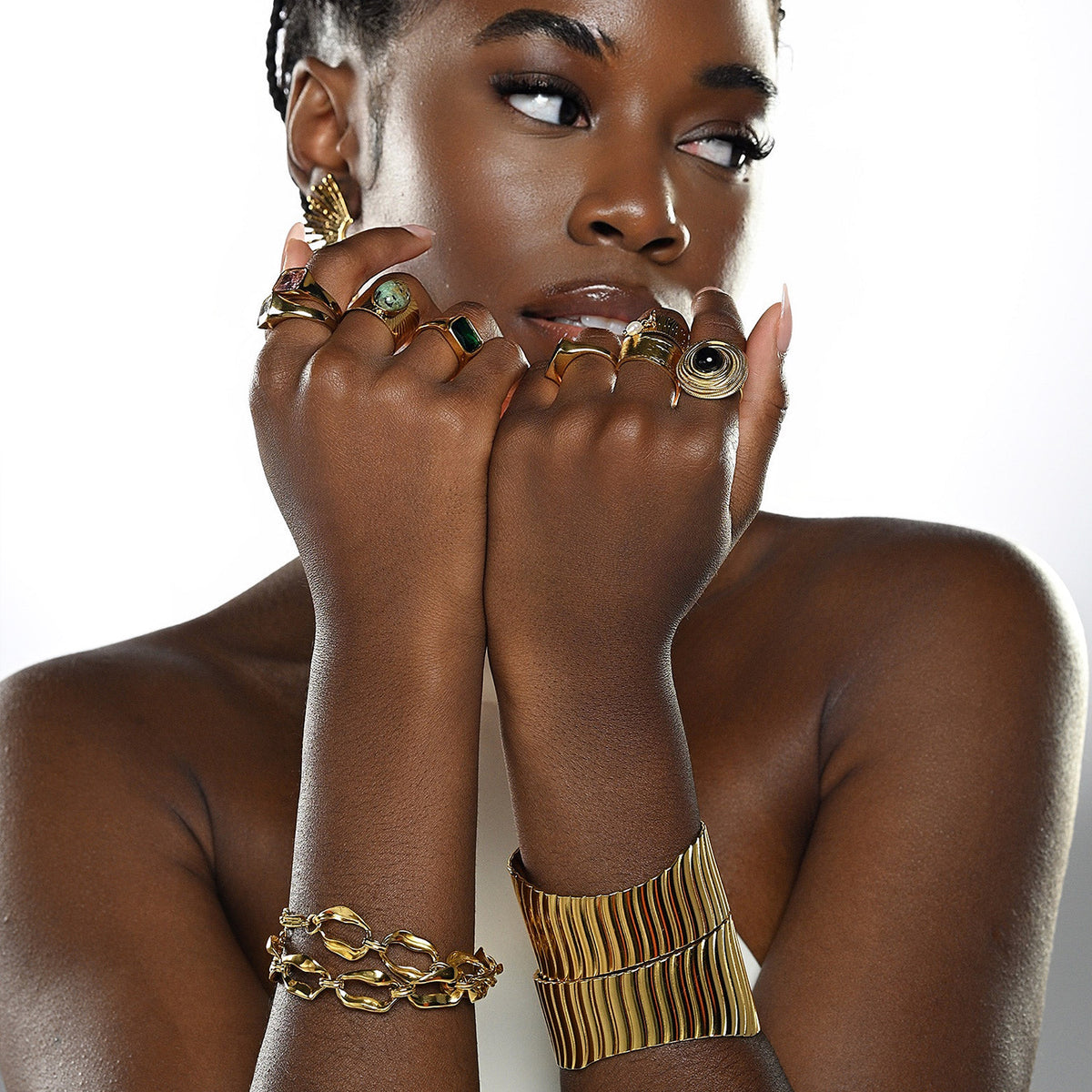 This Montego Glow Cuff Gold by Superdivajewellery is a bold and radiant accessory. With flowing lines and a sunbeam-inspired shape, this cuff is a golden homage to the heat, energy, and brilliance of Montego Bay. It radiates confidence with its luxe gold finish and radiant shine. Designed for the bold, this adjustable cuff is perfect for golden hour and beyond, and can be layered or worn alone.