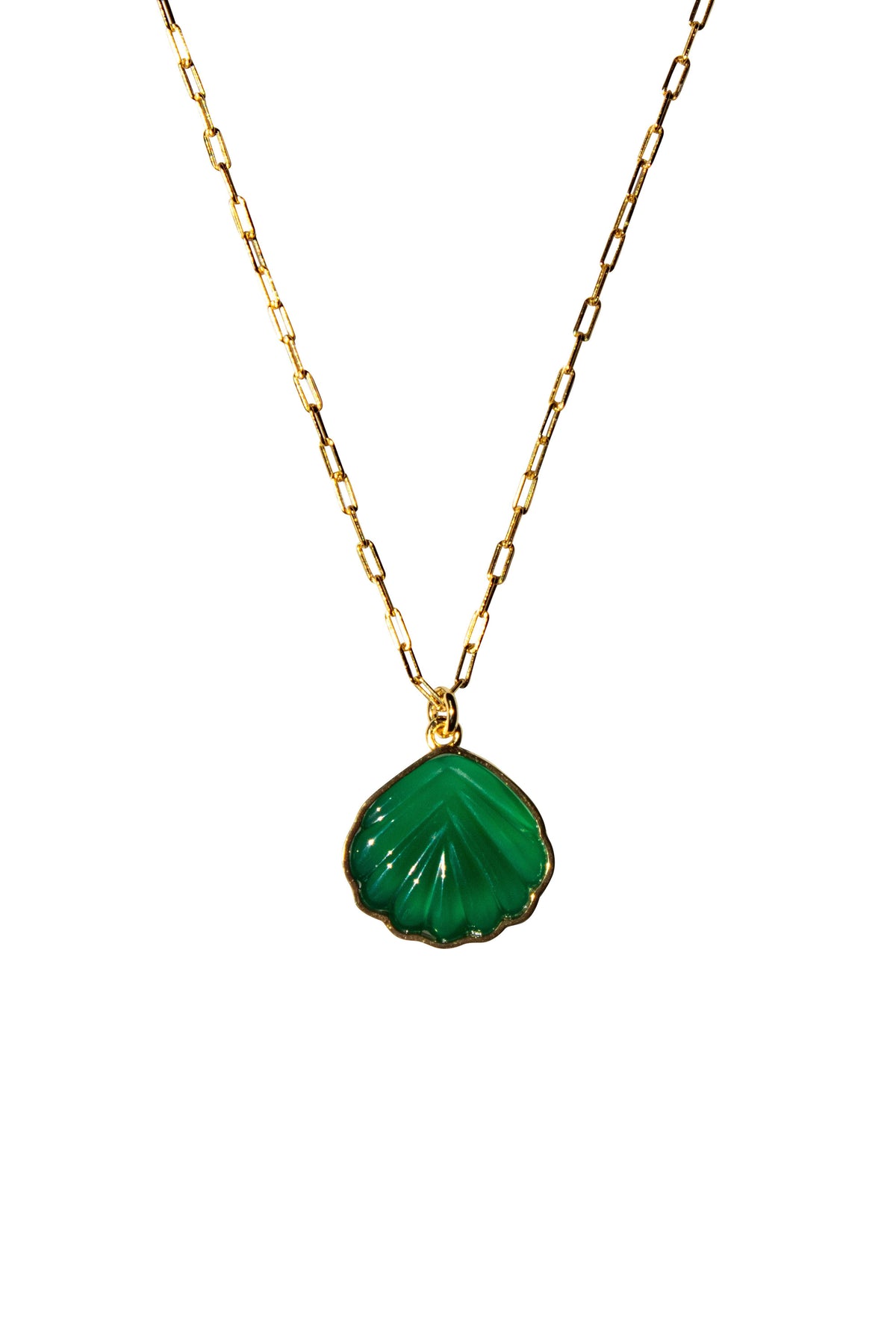 The Shell Green Jade Stone Pendant Necklace by Seree is a perfect balance of playful and polished, with a little coastal energy and a lot of cool-girl charm. It features a hand-carved green chalcedony shell set in gold-plated sterling silver, hanging from a sleek clip chain. Each piece is unique due to the natural characteristics of the chalcedony, making it a beautiful and elegant accessory.
