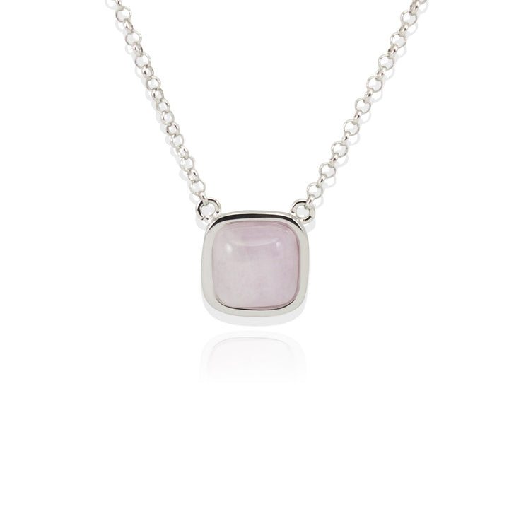 This necklace is cast from solid sterling silver and is decorated with a delicate, marble-like pink kunzite cabochon.