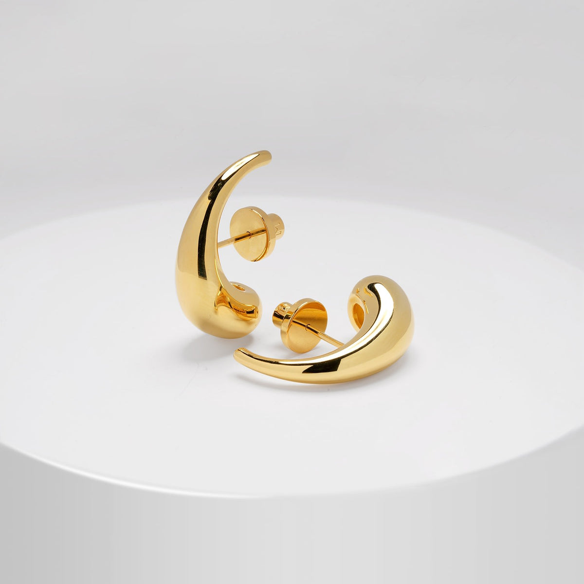 These drop earrings are crafted from 18K gold vermeil. They are designed in a curved, abstract waterdrop shape with a tapered form.