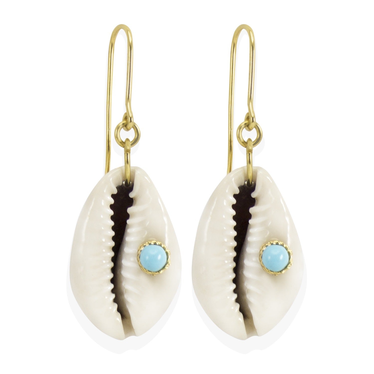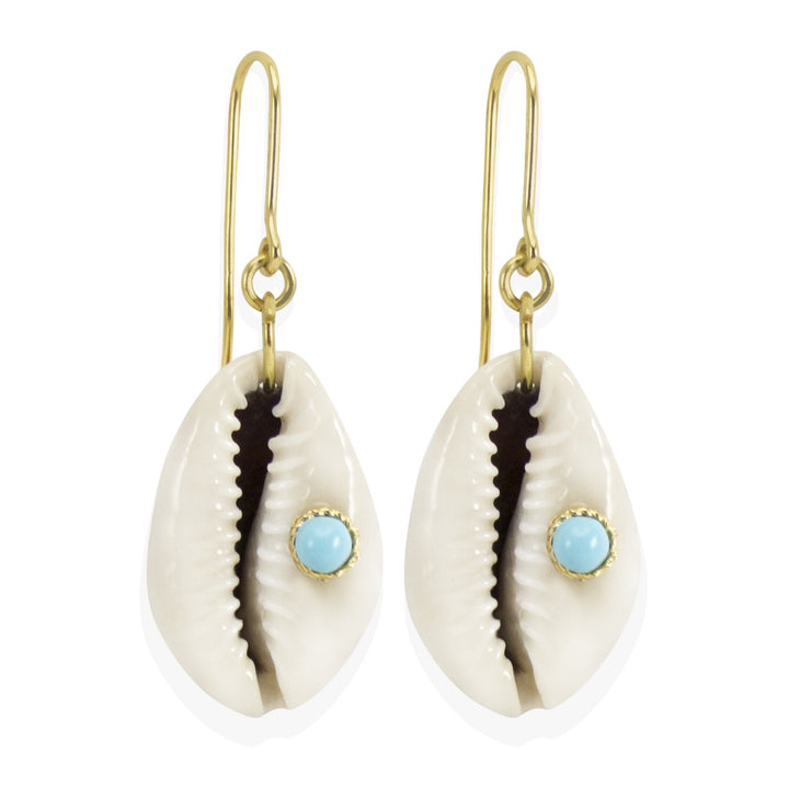 These earrings are handmade from sterling silver with an 18-karat yellow gold plating (1 micron) and feature cowrie shells with a turquoise bead. A palladium plate is applied before the gold plating.