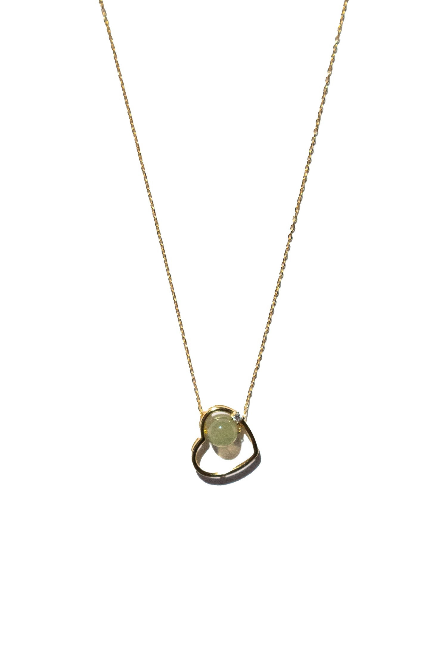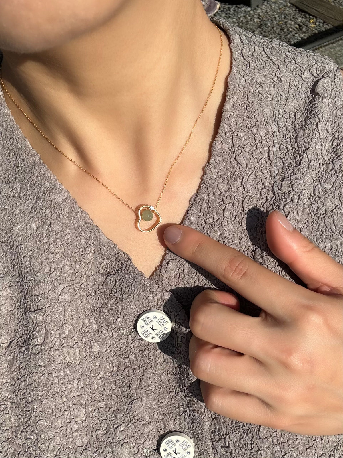 This necklace features a gold heart-shaped pendant with a zircon stone and a green jade bead.