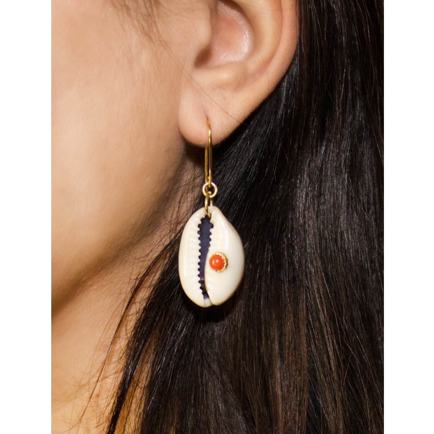 These Coral & Cowrie Shell Earrings by Vintouch Italy are a charming and unique accessory. The earrings feature white cowrie shells, a symbol of good luck and protection, marked with a pretty coral bead. Made from 18k gold over sterling silver, these earrings are a cute reminder that sunny days are on the horizon. These unique, handmade earrings are nickel-free and come in eco-friendly packaging, ensuring they are both stylish and consciously crafted.