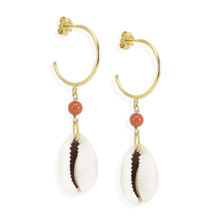 Handmade in 18-karat yellow gold over sterling silver (1 micron plating) with coral beads and cowrie shells.