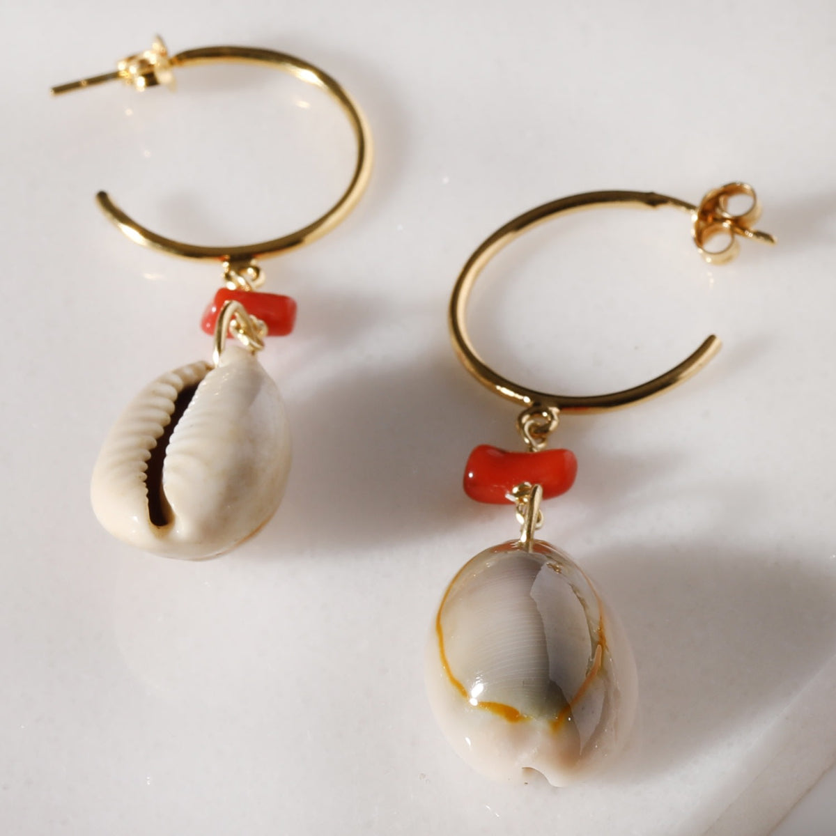These Coral & Cowrie Shell Hoop Earrings by Vintouch Italy celebrate the cowrie, an ancient emblem of good fortune and protection. Adorned with coral beads that bring warmth and energy, the earrings combine heritage symbolism with contemporary design. Handmade in Italy, they are a season’s trend that carries both beauty and meaning.