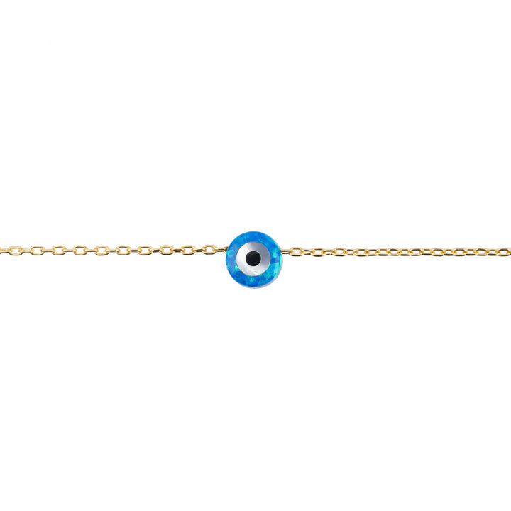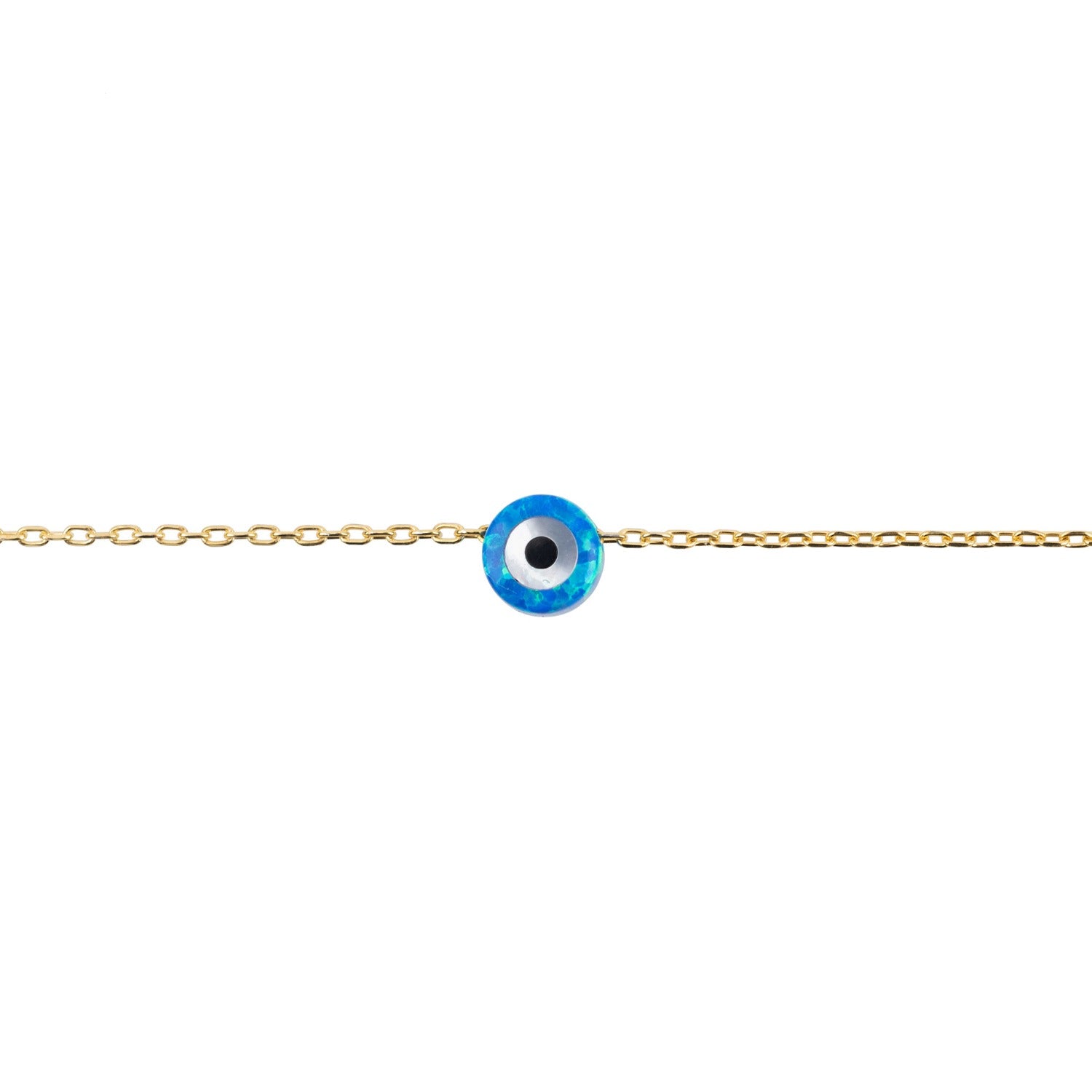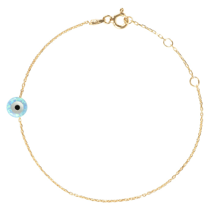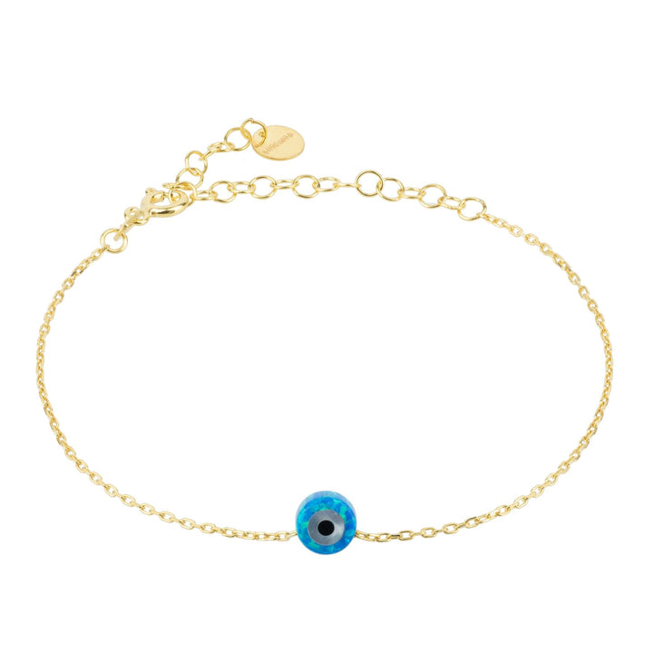 This bracelet is crafted from 925 sterling silver dipped in 18ct gold. It features a petite opalite evil eye and has a lobster clasp with a size adjuster.
