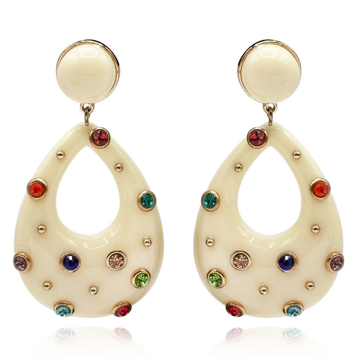 Ivory resin hoops accented with gold and multicolor crystals, lightweight construction.