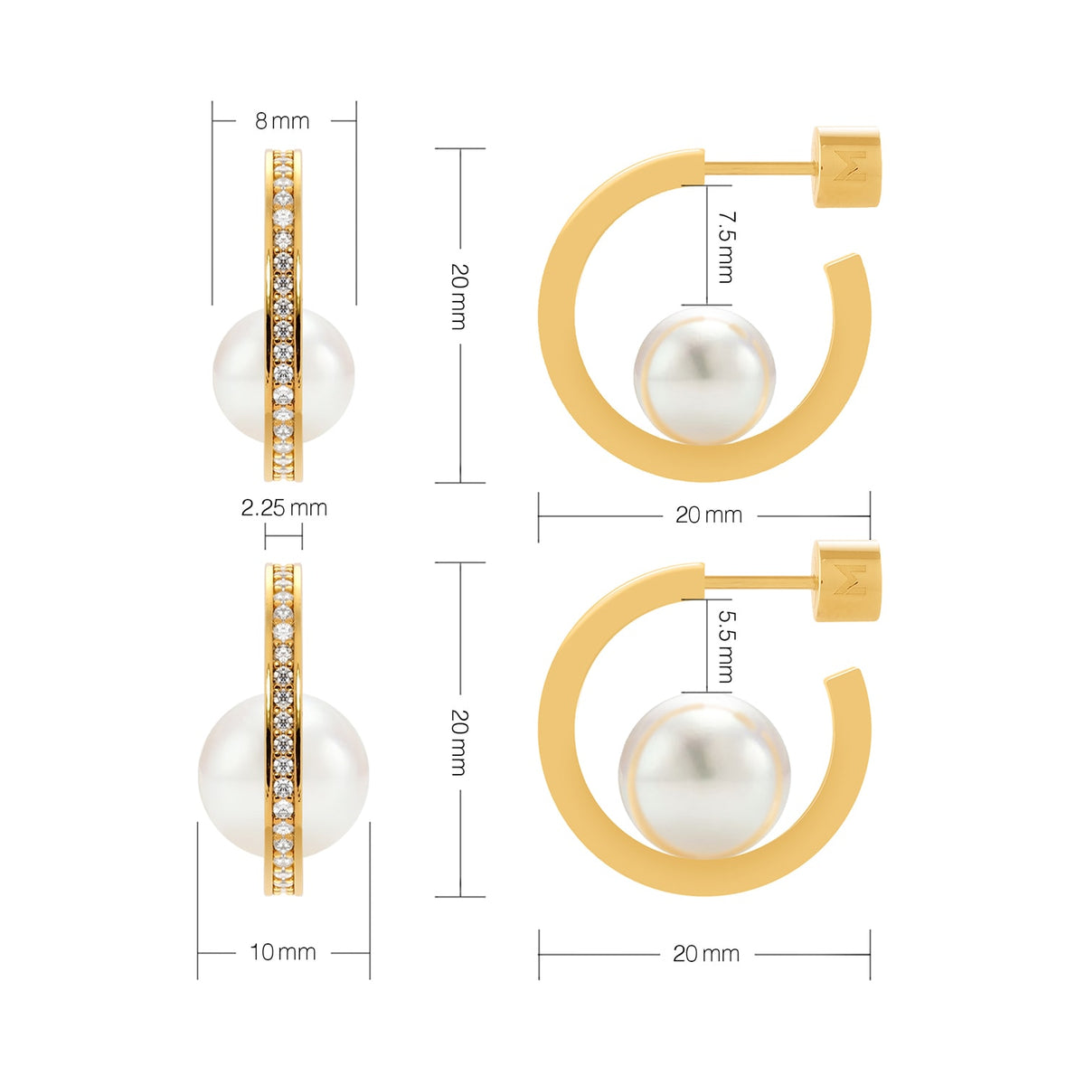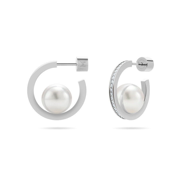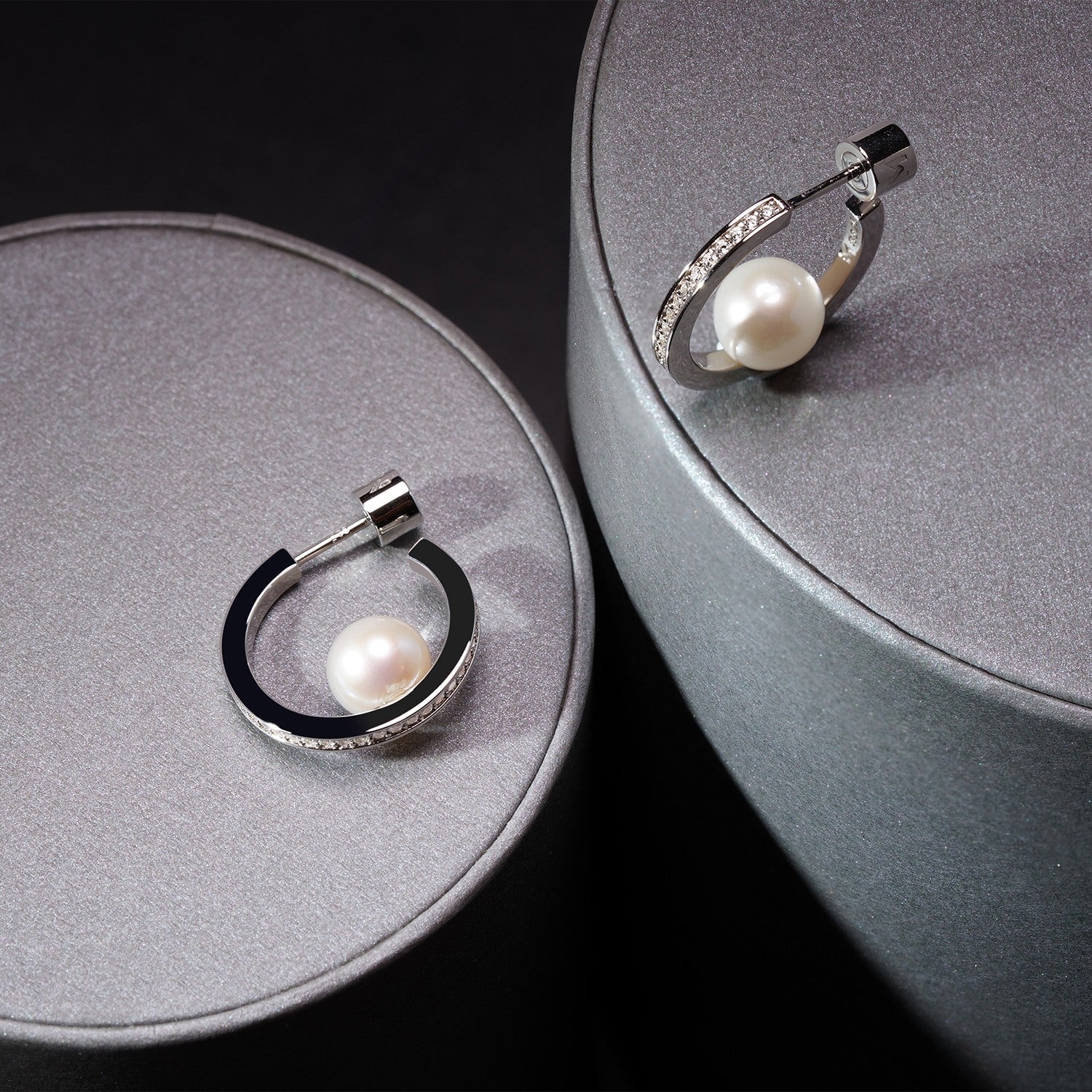 These Pearl Open Hoop Earrings by Meulien exhibit a freshwater pearl perched inside a square-edged open hoop. The exterior of the hoop is encrusted with pave-set clear cubic zirconia stones. The spherical pearl and the square-edged hoop create a sculptural presence, infusing the classic and timeless allure of a pearl with a touch of vigor and attitude. The pearl is 8mm in diameter.