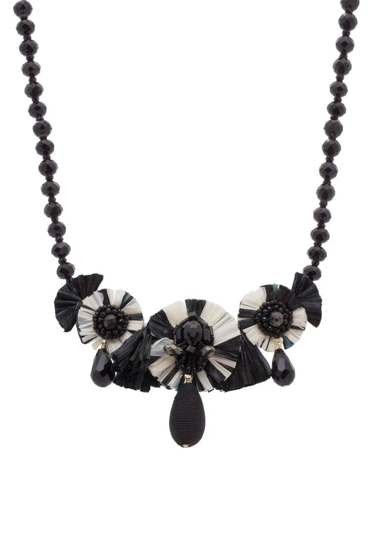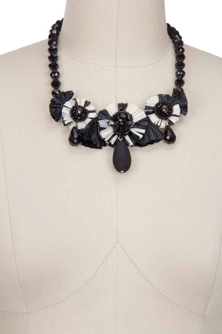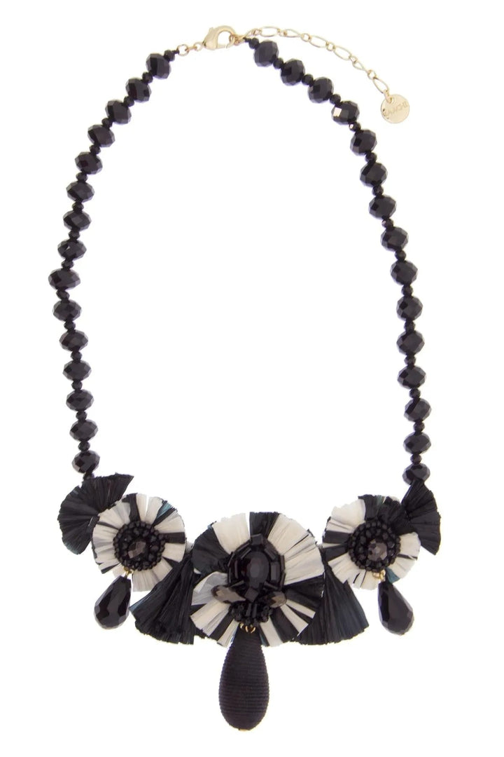 This Utsav Beaded Drop Necklace by Saachi is a bold and captivating statement piece that speaks loud and clear. It features shiny glass beads and three raffia discs that resemble blooming flowers, creating a dramatic and nature-inspired look. With its contrasting shades of white and black, this necklace is sure to make a statement and add an artful, bohemian flair to your outfit. The lobster closure and extender chain make it easy to wear and adjust.