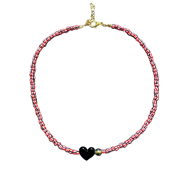 This handcrafted necklace features striped glass beads and a Murano glass heart charm, finished with a heart-shaped extension chain for an adjustable fit.