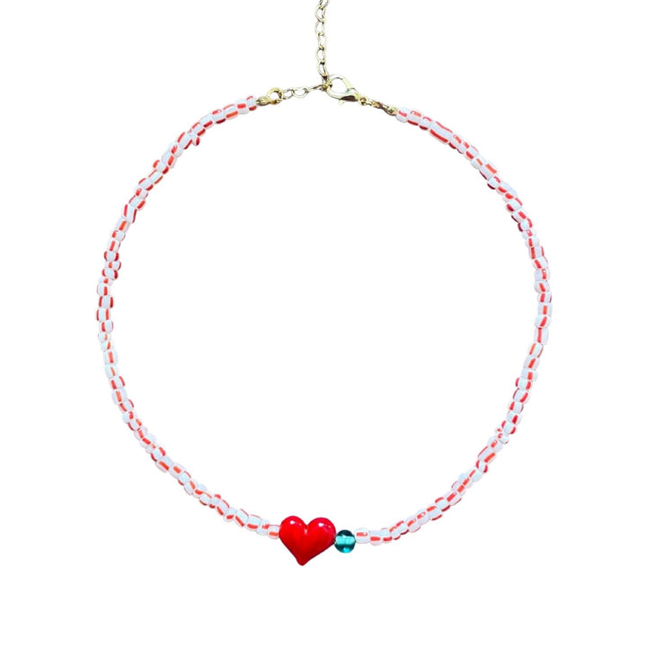 This handcrafted necklace features striped glass beads and a Murano glass heart charm, finished with a heart-shaped extension chain for an adjustable fit.