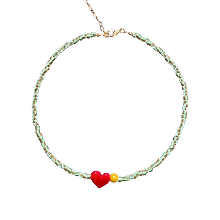 This Small Talk necklace by Desert Lobby is a playful and vibrant conversation starter, designed to bring a pop of color and personality to your style. Its whimsical design features a series of handcrafted striped glass beads that culminate in a charming Murano glass heart at its center, creating a piece that feels both youthful and bohemian. With its adjustable length, it’s a versatile accessory you can wear as a close-fitting choker or a slightly longer necklace. Each piece is unique, with subtle variations in the beads, making it a truly personal treasure.
