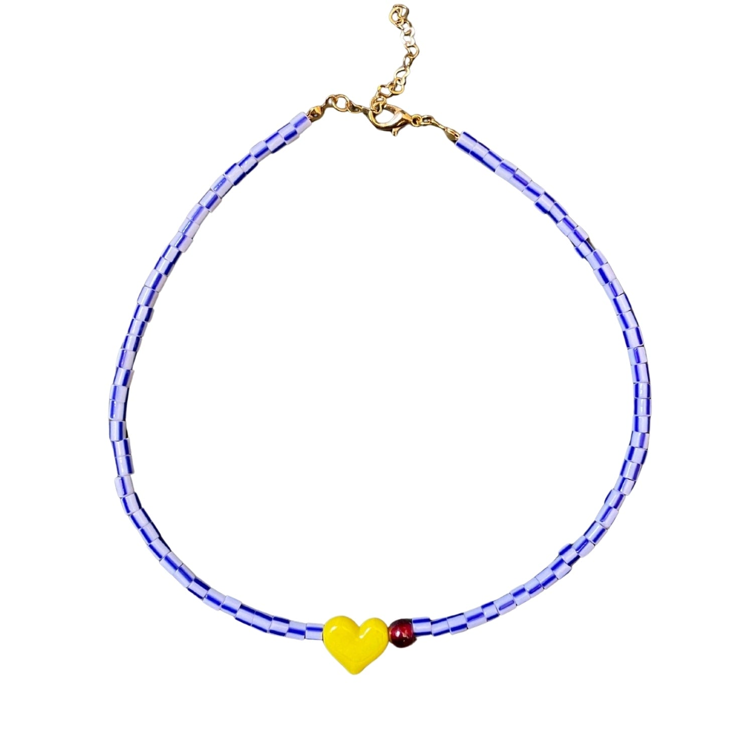 This handcrafted necklace features striped glass beads and a Murano glass heart charm, finished with a heart-shaped extension chain for an adjustable fit.